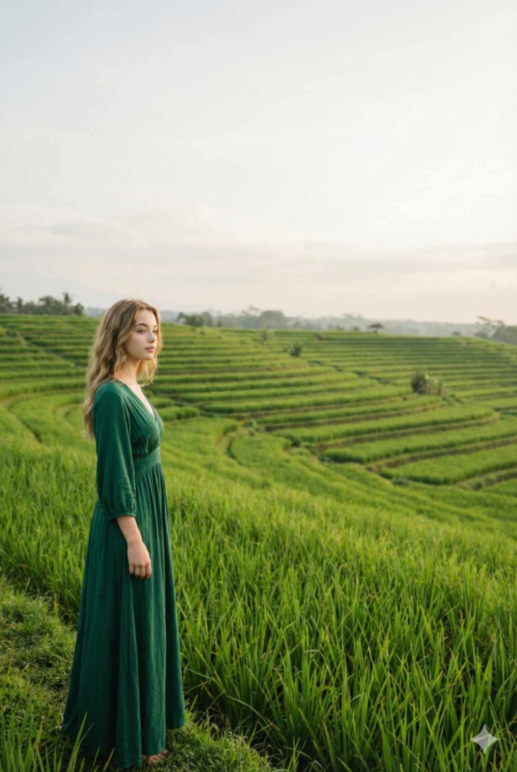 A realistic morning-light travel photograph of a woman standing in the rice fi elds at Tegallalang, Bali. She is wearing an emerald green fl owing boho maxi dress with long sleeves, loose wavy hair, natural glowing makeup. Pose: standing still, body slightly angled, face softly lit by morning sunlight, relaxed posture. Background: fresh green rice terraces with soft sunlight rays and gentle shadows. Shot wide, warm tones, fresh organic travel aesthetic. Ultra-realistic photography. Use reference image to keep the woman’s face exactly the same.