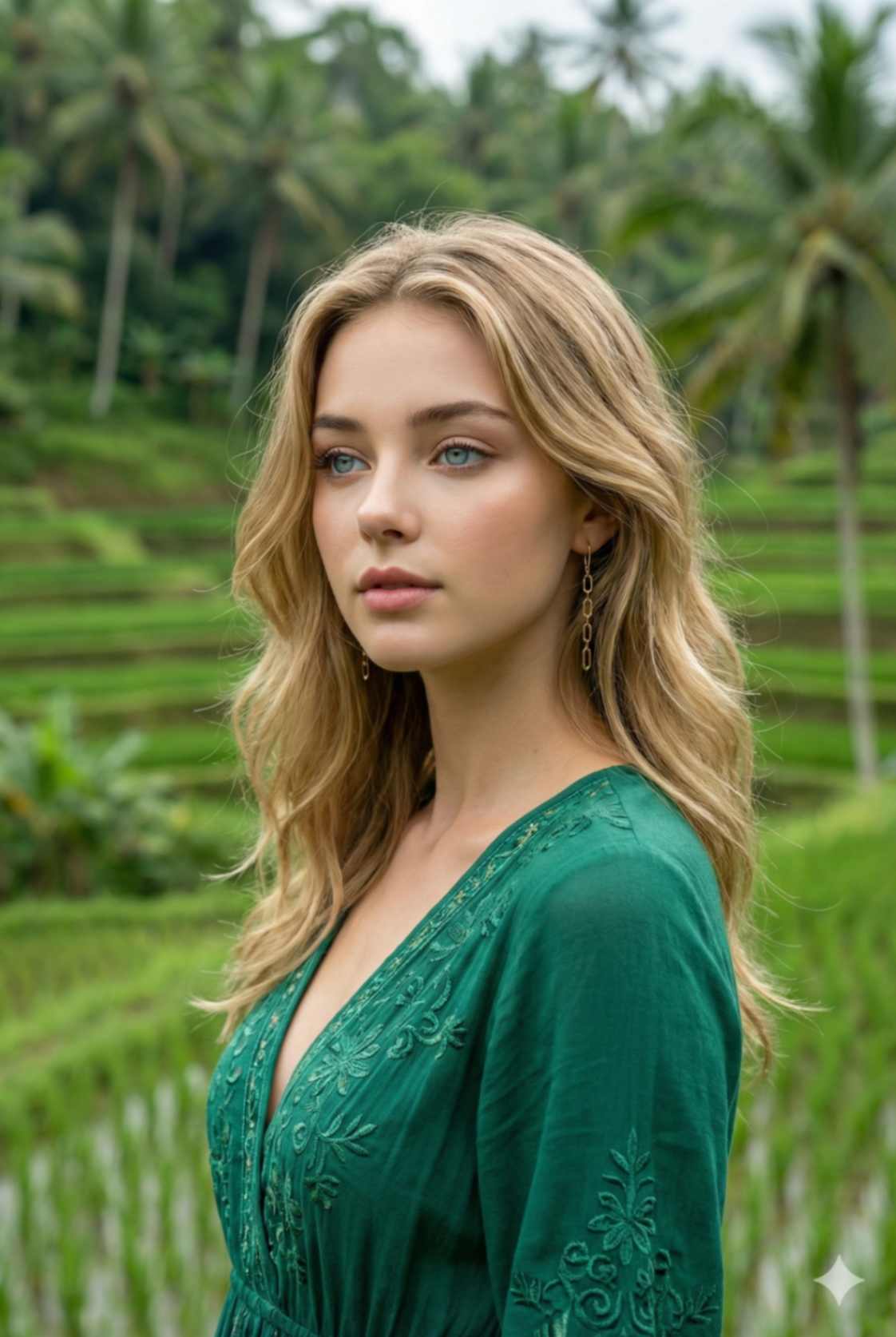 A realistic close-up travel portrait of a woman at Tegallalang Rice Terraces, Bali. She is wearing the same emerald green boho maxi dress, loose soft waves framing her face, natural glowing makeup. Pose: head slightly turned, eyes looking away from the camera, calm confi dent expression. Background: softly blurred green rice fi elds, natural daylight. Shot in portrait mode, shallow depth of fi eld, luxury infl uencer aesthetic. Ultra-detailed skin texture, realistic lighting. Use reference image to keep the woman’s face exactly the same.