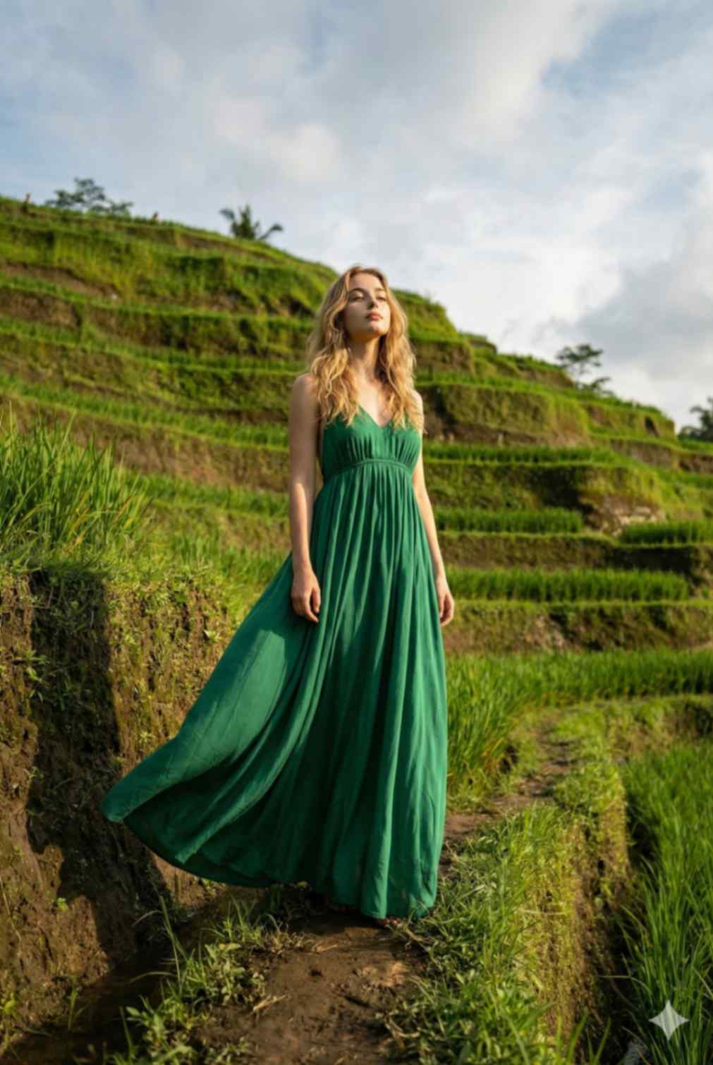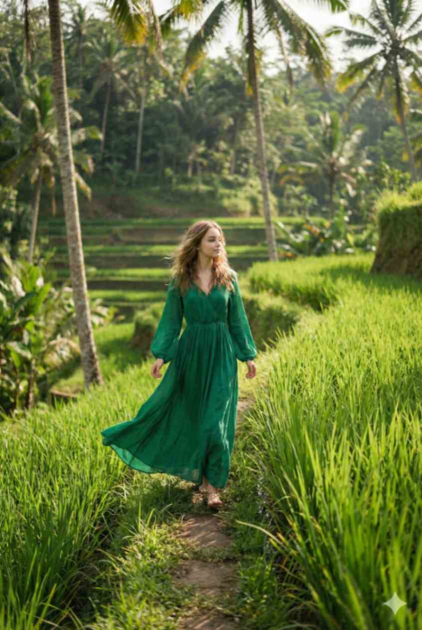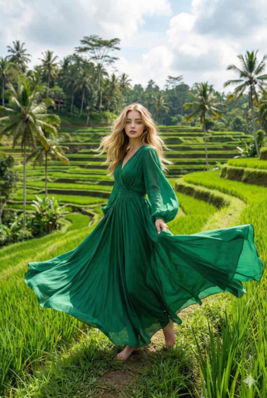 A dynamic fashion-travel photograph of a woman standing in the rice fi elds at Tegallalang, Bali. She is wearing the same emerald green fl owing boho maxi dress, fabric and sleeves moving gracefully in the breeze, loose hair fl owing. Pose: slight turn of the body, one foot forward, allowing the dress to move naturally. Background: green terraces, open sky, natural light. Shot wide, motion captured in fabric, fashion editorial travel vibe. Ultra-realistic, crisp details. Use reference image to keep the woman’s face exactly the same.