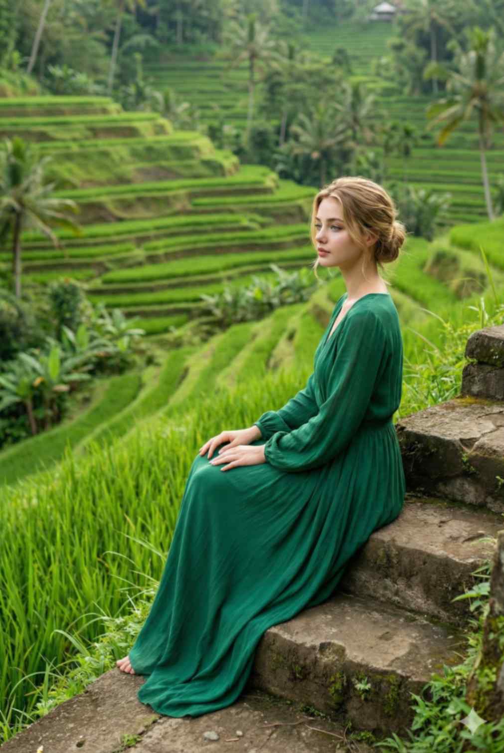 A serene slow-travel photograph of a woman sitting on a rice terrace step at Tegallalang, Bali. She is wearing the same emerald green fl owing boho maxi dress, long sleeves resting softly, natural glowing makeup. Pose: seated sideways, one leg slightly folded, hands resting gently, gaze toward the rice fi elds. Background: close-up green terraces, tropical plants, soft daylight. Shot medium-wide, relaxed and mindful mood. Ultra-realistic photography. Use the same reference face image to maintain consistency.