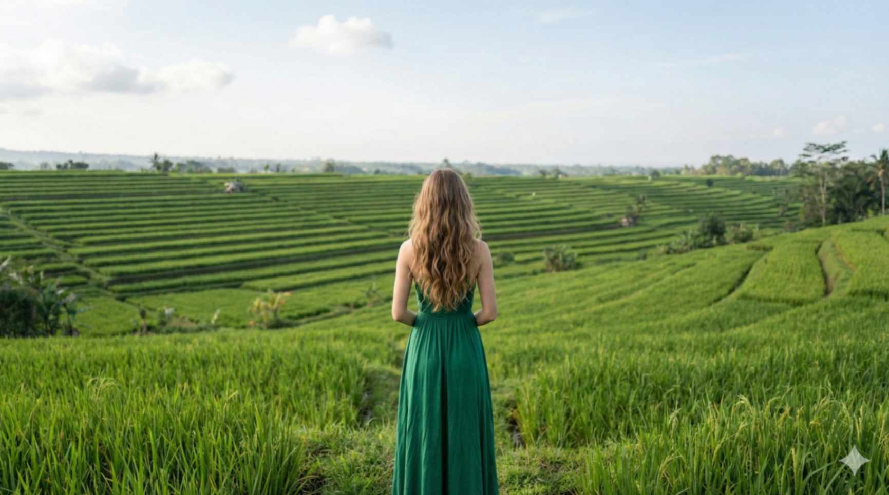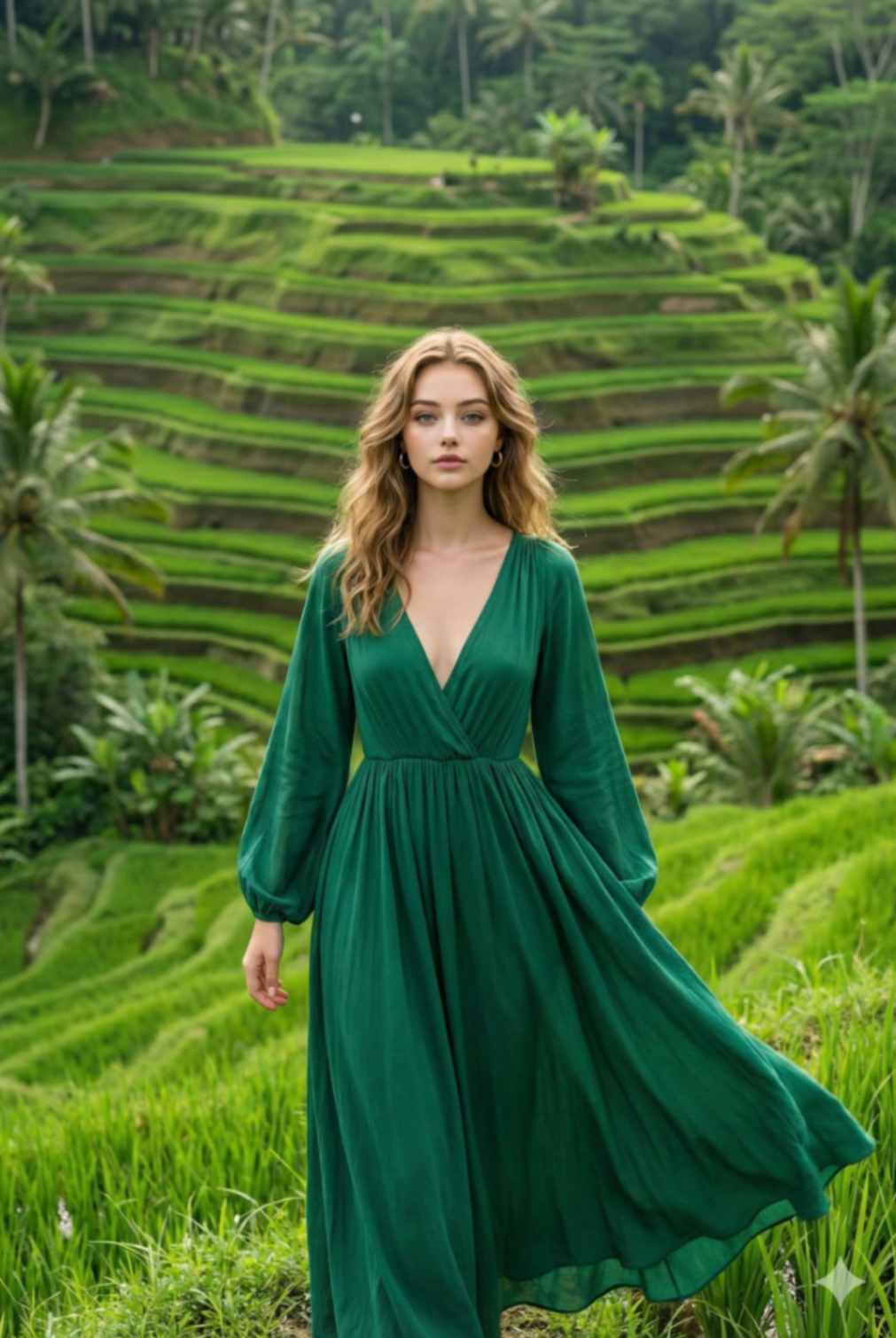 A realistic cinematic travel photograph of a woman standing in front of the lush layered rice terraces at Tegallalang, Bali. She is wearing an emerald green boho-style fl owing maxi dress with a deep V-neck and long loose sleeves, soft fabric moving gently in the breeze. Hair styled in loose natural waves, glowing natural makeup, minimal gold hoop earrings. Pose: standing still, body facing the rice fi elds, arms relaxed, calm confi dent posture. Background: vibrant green stepped rice terraces, tropical plants, soft daylight. Shot wide, slightly elevated angle, premium nature luxury aesthetic. Ultra-realistic photography, sharp details. Use reference image to keep the woman’s face exactly the same.