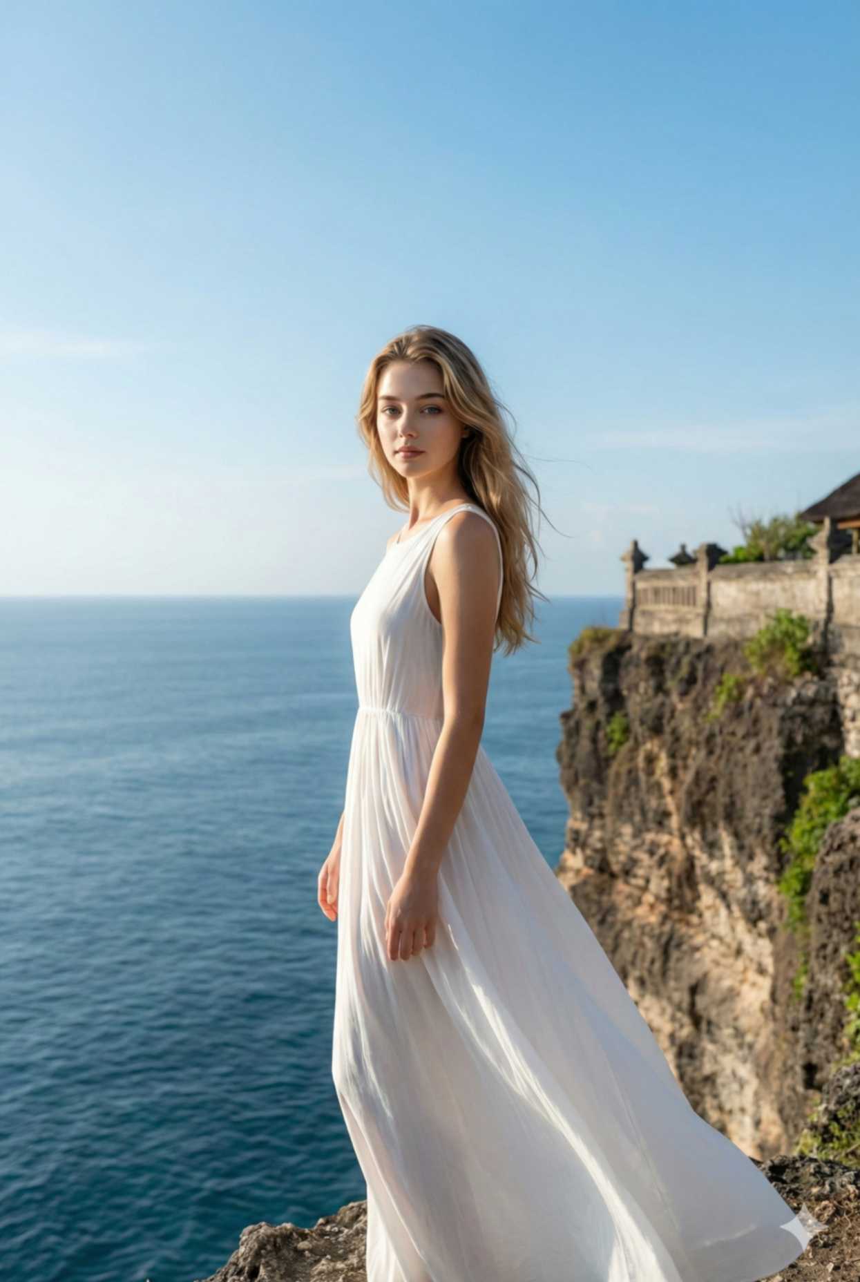 A minimal luxury travel photograph of a woman standing at the cliff edge of Uluwatu Temple, Bali. She is wearing a long white, fl owy sleeveless dress, fabric moving softly with the ocean breeze. Her hair is loose and fl owing naturally. Pose: She is standing still, centered in the frame, body slightly angled toward the ocean, head gently turned toward the camera so her face is clearly visible. Natural, calm expression — no forced pose. Framing & Composition: Wide shot, perfectly symmetrical framing, strong horizon line where the sky meets the sea. Clean, uncluttered composition with a premium minimal aesthetic. Lighting: Soft natural daylight, subtle highlights on her face and dress, cinematic yet realistic shadows. Style & Quality: Ultra-realistic, high clarity, premium luxury travel photography look. Natural skin texture, realistic facial details, editorial-grade sharpness. Important: Face and body must match the reference image exactly. No alteration to facial structure, skin tone, or identity.