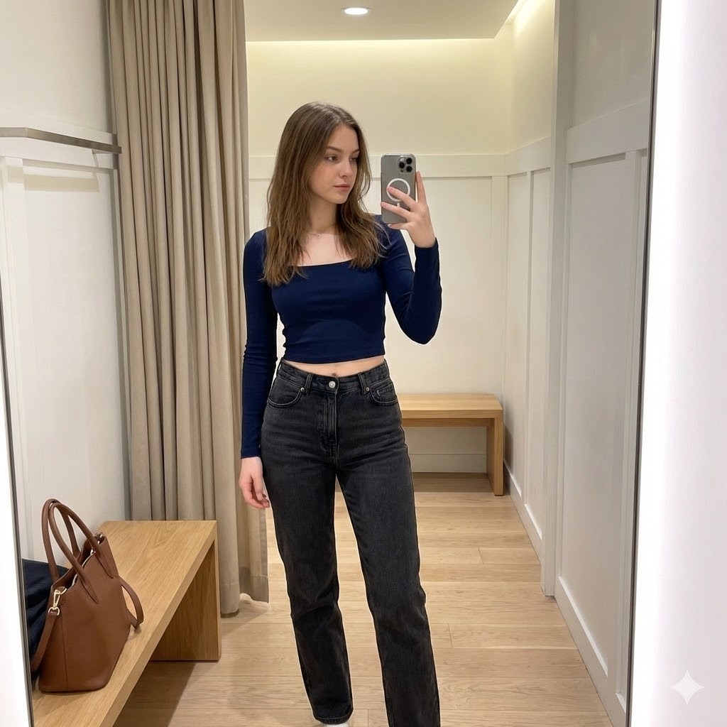 Create a hyper-realistic full-body mirror selfie of a young woman standing inside a minimal, softly lit fitting room with warm neutral tones and a clean aesthetic. Use this uploaded photo as the only and exact face reference. The generated image must use this same face exactly as shown, without any changes to identity, facial structure, or expression. She has a soft oval face with fair, smooth skin and natural warm undertones, subtle blush on her cheeks, and a calm, slightly serious expression with her lips relaxed and eyes looking slightly to the side rather than directly into the camera. Her eyes are medium-sized with a gentle almond shape, framed by straight, natural brows. Her hair is medium brown with soft dimension, worn down past her shoulders with natural texture and light volume, featuring straight-cut bangs that lightly graze her eyebrows and frame her face. She is holding a light-colored smartphone in her right hand at chest level, angled slightly inward as she captures the mirror selfie, partially covering the right side of her face. Her posture is relaxed and upright, with her weight subtly shifted to one leg, creating a natural hip curve. She is wearing a fitted navy blue long-sleeve crop top with a square neckline that highlights her collarbones and midriff, paired with high-waisted dark charcoal or black straight-leg jeans that fit snugly around the hips and thighs before falling straight down. The fabric textures should appear realistic — soft, stretchy cotton for the top and structured denim for the jeans. The background features a beige floor-length curtain directly behind her, white paneled walls on one side, and a wooden door frame visible along the mirror’s edge. The flooring is light wood, adding warmth to the scene. A white bench sits to the side with a structured brown leather handbag placed on top, contributing to the casual shopping-room setting. Lighting is soft and even from overhead fixtures, casting gentle shadows under her chin and along her waist while maintaining natural skin texture. The overall mood is clean, modern, and effortlessly stylish, with realistic proportions, accurate reflections, and authentic indoor fitting-room ambiance.