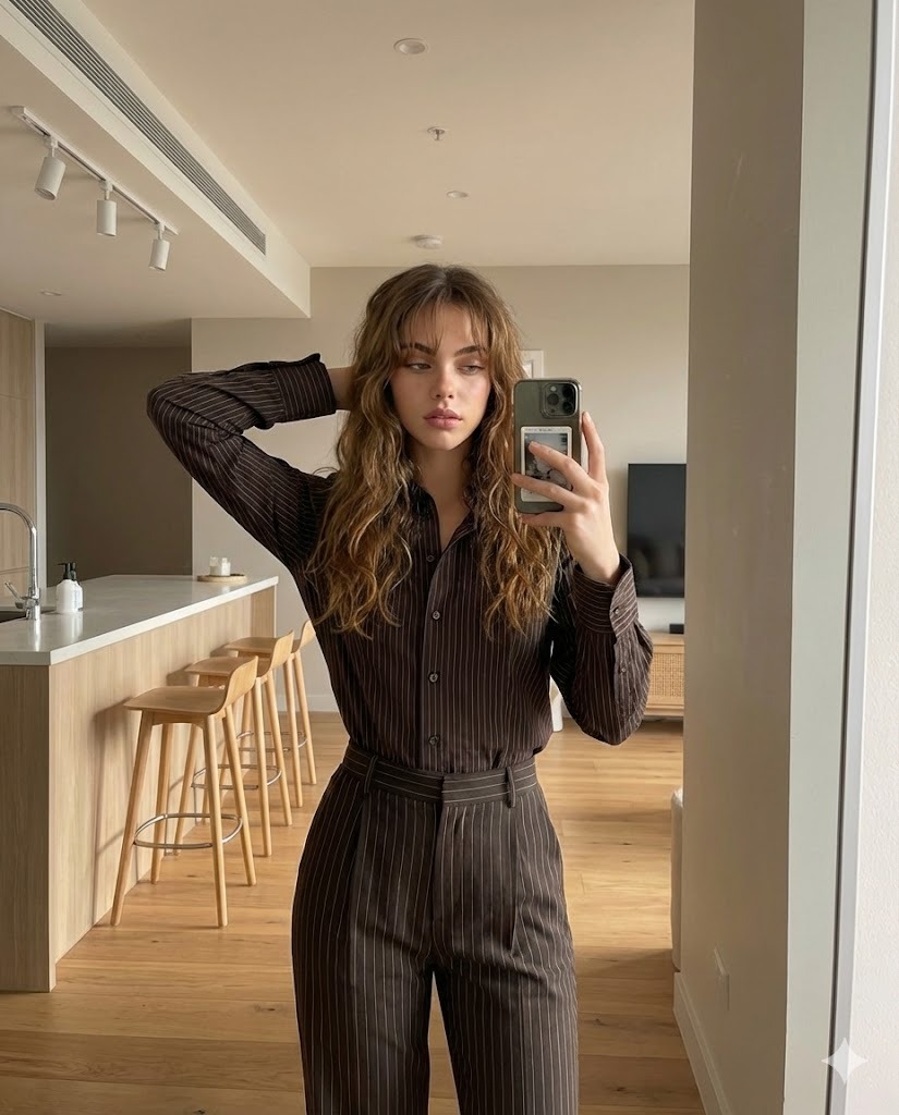 Create a realistic, softly lit mirror selfie portrait of a young woman standing in a modern, minimalist apartment interior. Use this uploaded photo as the only and exact face reference. The generated image must use this same face exactly as shown, without any changes to identity, facial structure, or expression. She has a delicate oval-shaped face with fair skin and a natural matte finish, subtle freckles scattered across her cheeks and nose, softly defined brows, full natural lips in a muted pink tone, and a calm, slightly serious expression with relaxed eyes looking at her phone screen. Her hair is long, straight to slightly wavy, deep brown with soft shine, styled with light wispy bangs framing her forehead and the rest falling past her shoulders. One hand is raised behind her head, fingers gently resting in her hair, creating a casual, effortless pose, while the other hand holds a modern smartphone in front of her face, partially covering the right side. She is wearing a fitted dark brown pinstripe button-up shirt with thin vertical white stripes, structured tailoring, and matching high-waisted pinstripe trousers, creating a coordinated, chic, slightly androgynous aesthetic. The fabric appears smooth and tailored, gently contouring her silhouette. The environment is a contemporary open-plan living space with warm wooden flooring, soft neutral walls, and a minimalist kitchen area visible in the background. There are light wood bar stools aligned at a kitchen island, a clean white countertop, subtle track lighting on the ceiling, and a wall-mounted television in the distance displaying a blurred scene. The lighting is soft natural daylight mixed with gentle indoor ambient light, evenly illuminating her face without harsh shadows, creating a warm, cozy, modern atmosphere. The color palette blends warm browns, soft creams, and muted neutrals, giving the image a stylish, editorial yet candid feel. Ensure accurate mirror perspective, realistic reflections, sharp skin texture, detailed fabric lines in the pinstripes, natural depth of field, and an authentic lifestyle photography aesthetic.