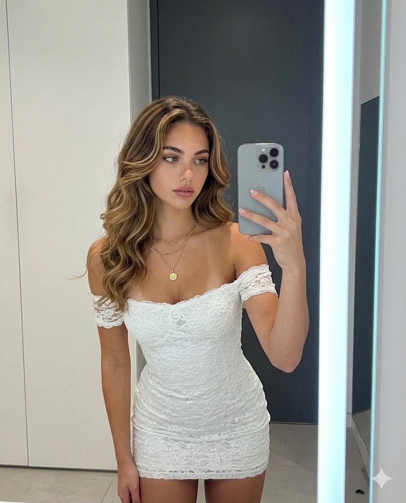 Create a hyper-realistic mirror selfie portrait of a young woman standing in a modern, softly lit indoor space with minimalistic white and dark gray walls. She is positioned in front of a tall mirror with a bright vertical LED light strip glowing along the right side, casting even, cool-toned illumination across her face and body. The environment feels sleek, clean, and contemporary, with smooth surfaces and a subtle contrast between light and shadow. She is holding a silver smartphone with three visible rear camera lenses in her right hand, raised near her face as she captures the mirror selfie. Her posture is poised and confident, with one arm slightly extended to hold the phone while the other rests naturally by her side. Use this uploaded photo as the only and exact face reference. The generated image must use this same face exactly as shown, without any changes to identity, facial structure, or expression. Her facial features are refined and symmetrical, with warm tan skin, sculpted cheekbones, softly defined brows, almond-shaped brown eyes, a slim nose, and full neutral-toned lips set in a calm, composed expression. She is looking slightly to the side rather than directly at the phone screen, giving the image a candid yet polished feel. Her hair is long and styled in glamorous loose waves, with a rich brunette base blended with lighter blonde highlights that frame her face and cascade over one shoulder. The waves are smooth and glossy, reflecting the soft LED lighting. She is wearing a fitted white lace mini dress with an off-the-shoulder neckline that elegantly exposes her collarbones and shoulders. The dress features long semi-sheer lace sleeves and intricate floral lace detailing throughout, hugging her figure closely and ending mid-thigh. The lace texture is delicate and detailed, with subtle transparency in the sleeves and a structured bodice that enhances her silhouette. Around her neck, she wears layered gold necklaces, including a small circular pendant resting at the center of her chest, adding a subtle touch of elegance and warmth against the white lace. The lighting is balanced and flattering, highlighting the texture of the lace fabric, the shine of her hair, and the natural glow of her skin without harsh shadows. The overall mood is chic, confident, and sophisticated, with a high-end, social-media-ready aesthetic. Focus on precise body proportions, realistic skin texture, accurate lace detailing, natural reflections in the mirror, and authentic lighting gradients to ensure perfect and repeatable recreation of the same person, pose, outfit, and atmosphere.