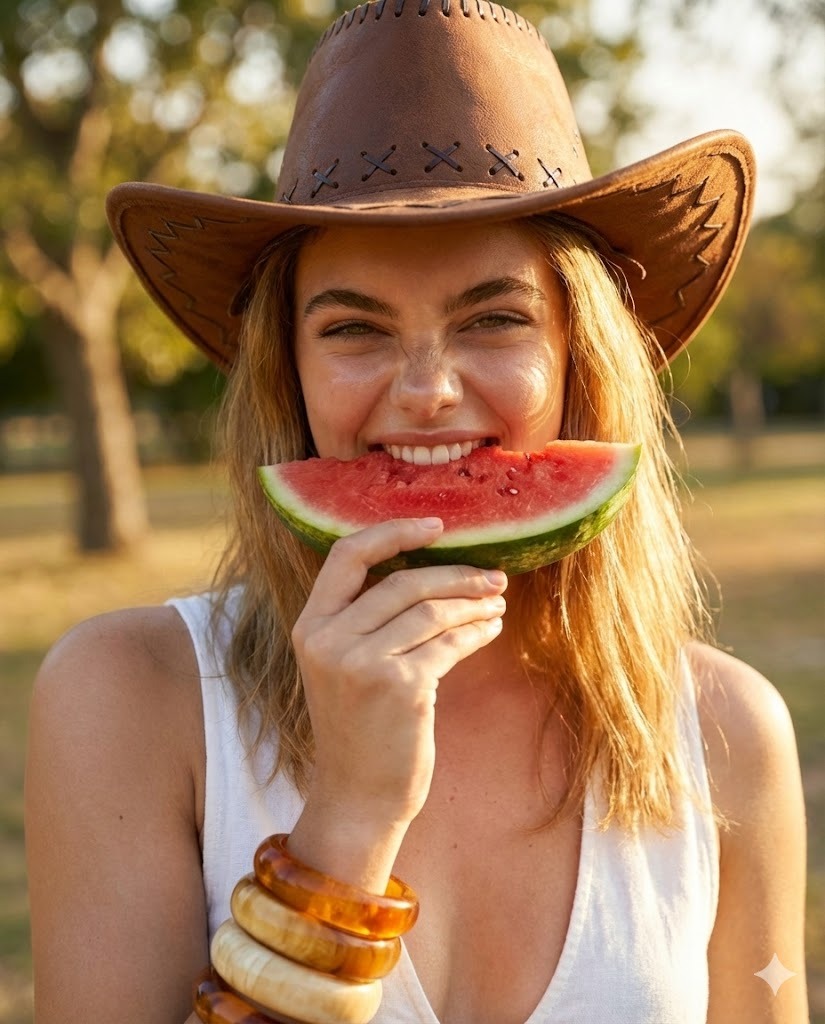 Create a vibrant, close-up outdoor portrait of a young woman captured in warm golden-hour sunlight, framed from the shoulders up with a shallow depth of field. Use this uploaded photo as the only and exact face reference. The generated image must use this same face exactly as shown, without any changes to identity, facial structure, or expression. She has a soft oval face with fair, smooth skin glowing under warm natural light, defined brows, light-colored eyes partially squinting playfully, and a bright expressive smile revealing her teeth as she bites into a juicy slice of red watermelon. Her expression is lively, spontaneous, and slightly mischievous, with her nose gently scrunched and eyes narrowed in a joyful, candid moment. Her hair is shoulder-length, blonde with soft loose waves, slightly tousled and illuminated by sunlight that creates golden highlights and soft shadows between the strands. She is wearing a rich brown leather cowboy-style hat with visible stitched detailing and decorative cross-stitch accents around the crown, adding texture and rustic character. On her wrist, she wears chunky translucent amber and cream-toned bangles that catch the light subtly. The watermelon slice is vibrant red with visible seeds and a fresh green rind, held close to her mouth with natural hand positioning and realistic finger placement. She appears to be wearing a light, airy white sleeveless top with soft fabric texture, exposing her shoulders and enhancing the summery mood. The background is softly blurred with hints of a tree trunk and bright outdoor environment, creating a natural, sunlit atmosphere. The lighting is warm, directional, and golden, casting soft highlights on her cheekbones, nose bridge, and shoulder while creating gentle shadow contrast for a cinematic, summery aesthetic. The color palette blends warm browns, golden skin tones, bright watermelon red, and soft natural greens, producing a joyful, carefree summer vibe. Ensure high detail in skin texture, realistic fruit texture and moisture, accurate sunlight falloff, and a professional lifestyle photography feel with natural depth and warmth.