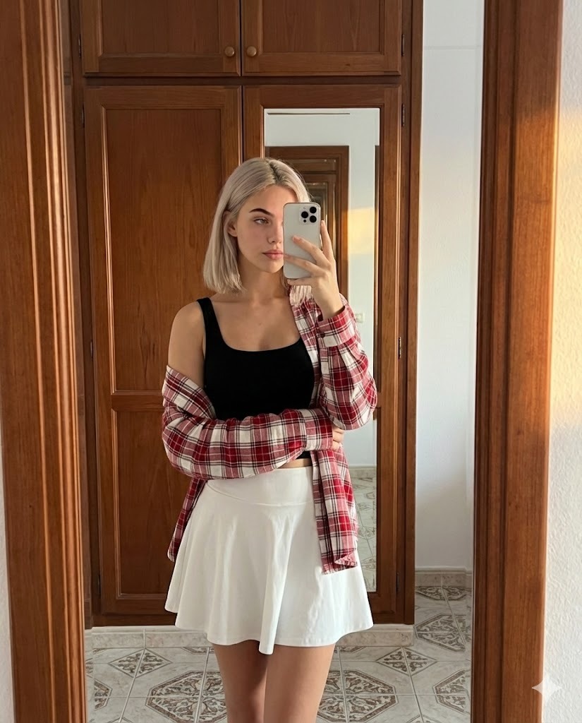 Create a highly realistic mirror selfie portrait of a young woman standing indoors in front of a tall wooden wardrobe with rich brown vertical wood grain panels. Use this uploaded photo as the only and exact face reference. The generated image must use this same face exactly as shown, without any changes to identity, facial structure, or expression. She has a soft oval face, fair skin tone with a smooth natural finish, light blonde straight bob-length hair cut just above the shoulders with a deep side part, neatly tucked behind one ear on one side, and natural light makeup with defined brows, subtle eyeliner, light mascara, and nude-pink lips. Her expression is calm and slightly introspective with a gentle, relaxed gaze directed toward her phone screen. She is holding a silver smartphone with three rear cameras in her right hand, partially covering part of her face as she takes the mirror selfie. She is wearing a fitted black sleeveless tank top with thin straps and a scoop neckline, paired with a high-waisted white flared mini skirt that has a soft, airy, slightly pleated structure creating volume. A red and white plaid shirt is loosely draped off her shoulders and arms, hanging casually and adding a relaxed layered look. Her posture is natural and slightly angled, with one hip subtly shifted, one leg slightly bent forward, and her left arm resting down in a relaxed position. The lighting is soft and natural, coming from the side, gently illuminating her face and upper body while creating soft shadows along the wardrobe panels behind her. The background includes a modern interior setting with clean white walls on one side and patterned floor tiles featuring circular floral geometric designs in black and beige tones. There is warm ambient lighting near the floor casting a subtle golden glow along the bottom edge of the wardrobe, adding depth and warmth to the scene. The overall mood is casual, stylish, and effortlessly confident, with a modern minimalist indoor aesthetic. Ensure high realism, sharp focus, accurate skin texture, natural color tones, balanced exposure, and authentic mirror reflection perspective so that every detail — from the hair strands to the fabric folds and lighting falloff — matches the original image precisely.