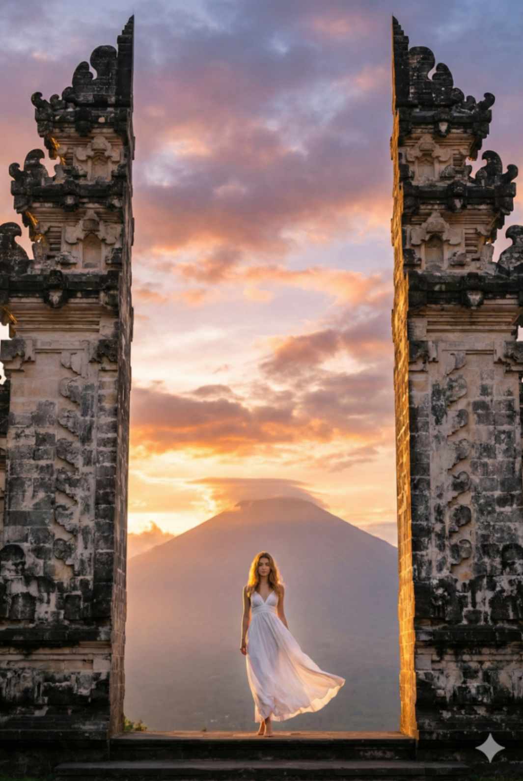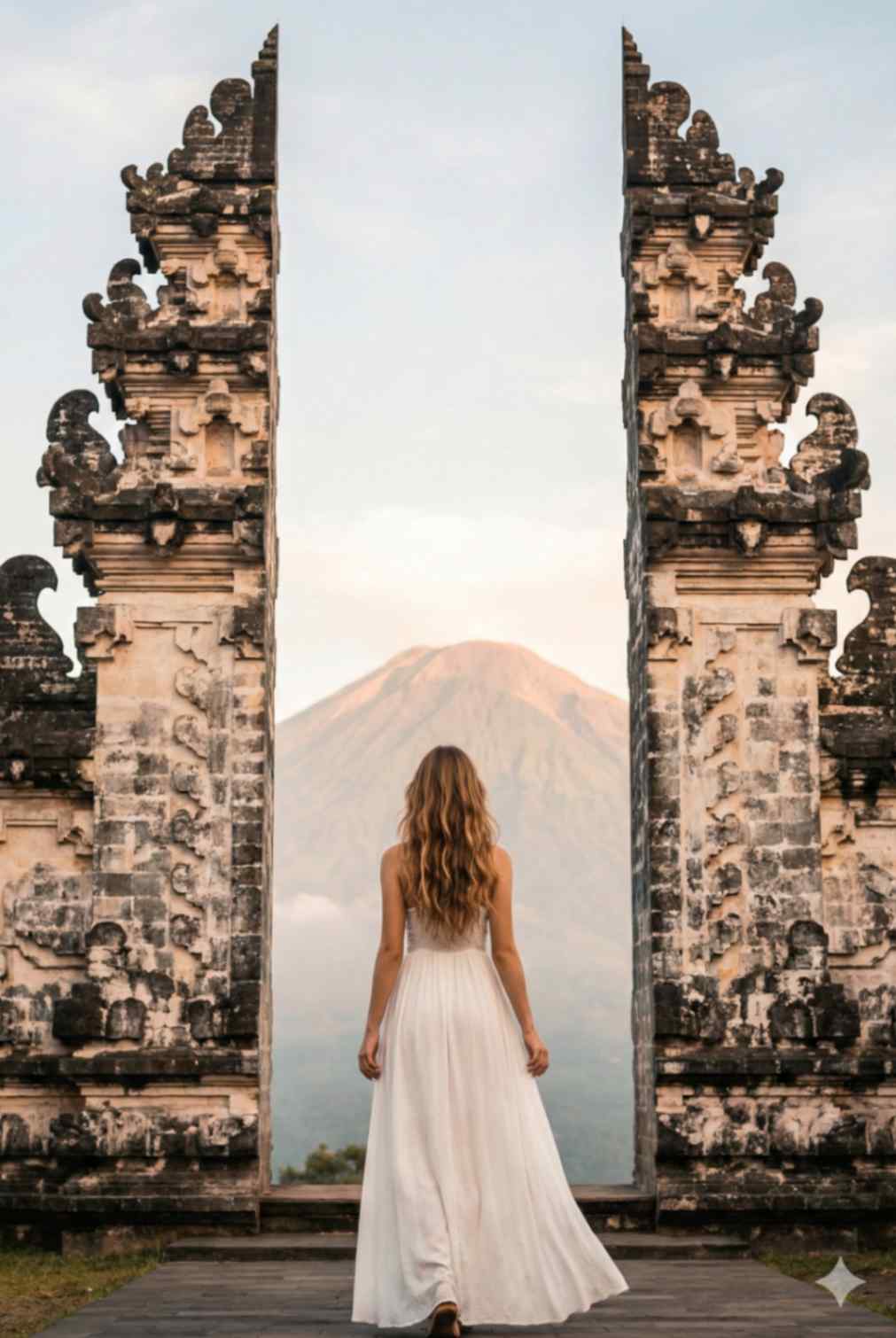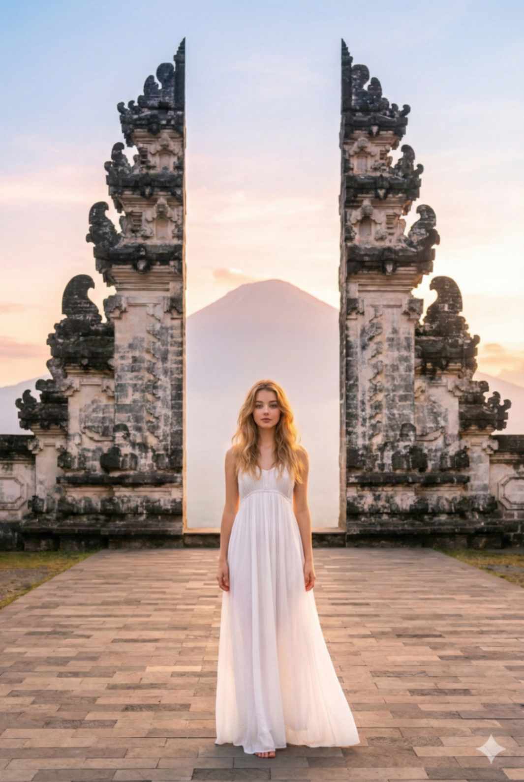 A serene sunrise travel photograph of a woman standing centered at the Gate of Heaven at Lempuyang Temple, Bali. She is wearing the same white fl owing maxi dress, loose waves softly lit by early morning light. Pose: standing still, calm posture, peaceful expression. Background: soft pastel sunrise sky, Mount Agung visible between the gates. Shot wide, gentle warm tones, spiritual and serene mood. Ultra-realistic photography. Face identity must remain identical using the reference image.