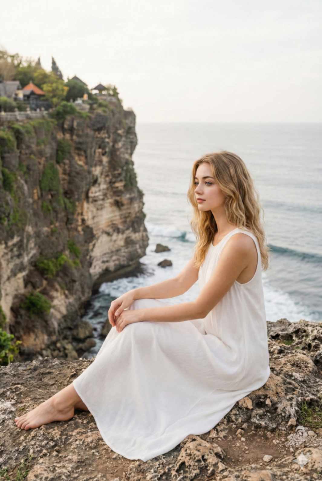 A peaceful lifestyle travel photograph of a woman sitting near the edge of a cliff at Uluwatu Temple, Bali. She is wearing the same long white fl owy sleeveless dress, loose wavy hair, natural makeup. Pose: seated with legs folded to one side, hands resting gently, looking toward the ocean. Background: calm ocean waves, rocky cliff textures, soft daylight. Shot medium distance, relaxed composition, serene and mindful atmosphere. Ultra-realistic photography, soft tones. Use the same reference photo to keep facial identity consistent.