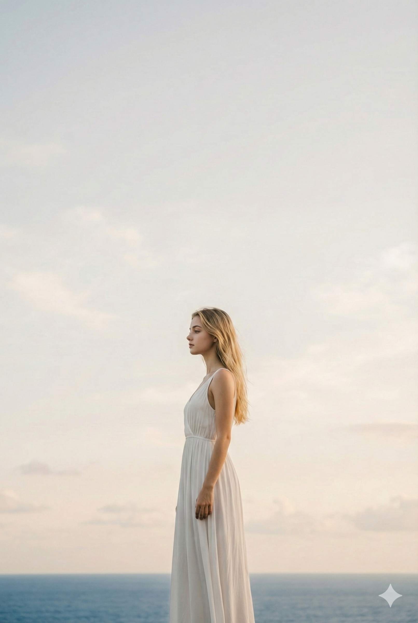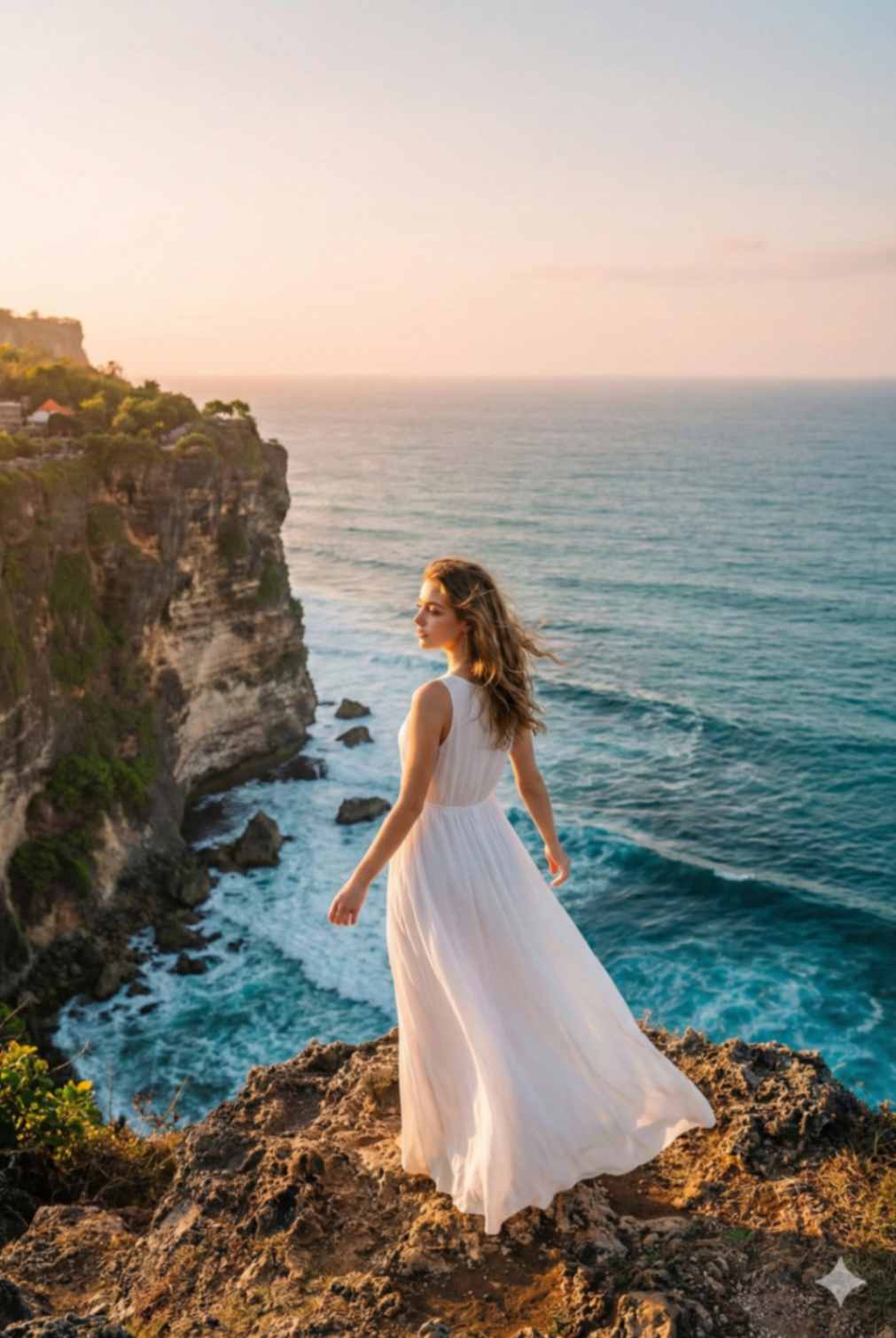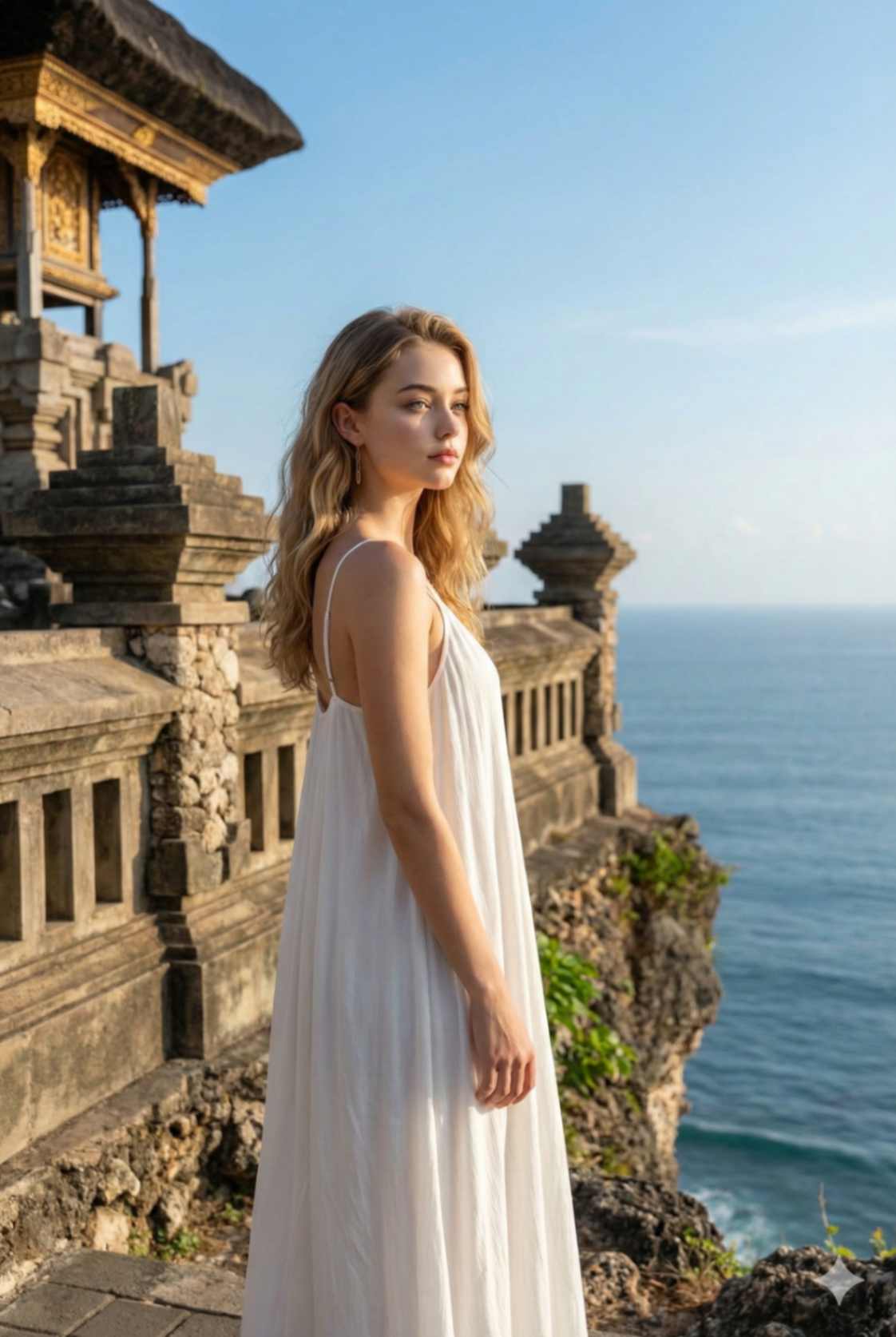 A realistic cinematic travel photograph of a woman standing at the edge of a dramatic ocean cliff at Uluwatu Temple, Bali. The woman is wearing a long white fl owy sleeveless maxi dress, loose wavy hair gently moving in the wind, minimal jewelry, natural makeup. She is standing still, body facing the ocean, back slightly turned toward the camera, relaxed posture, arms naturally down. Massive turquoise ocean below, rugged rocky cliffs, soft golden sunset light, clear sky. Shot in wide angle, subject centered but small compared to the landscape, luxury travel aesthetic, calm and powerful mood. Ultra-realistic photography, cinematic lighting, high detail, sharp focus. Use reference image for the woman’s face to keep it identical.