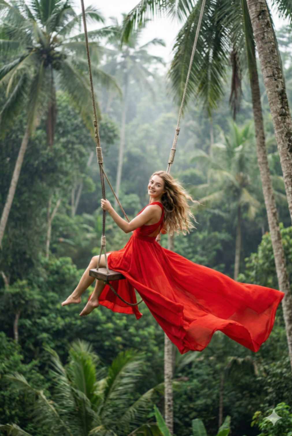 A realistic cinematic travel photograph of a woman swinging high over the lush jungle at the Ubud Jungle Swing in Bali. She is wearing a bright red fl owing maxi dress with lightweight fabric dramatically fl owing in the air, loose long wavy hair moving with the wind, natural glowing makeup. Pose: sitting on the swing, legs slightly forward, hands holding the ropes, confi dent joyful posture. Background: deep green jungle valley, tall palm trees, misty atmosphere. Shot wide, capturing full swing motion, iconic viral Bali travel aesthetic. Ultra-realistic photography, sharp detail. Use reference image to keep the woman’s face exactly the same.