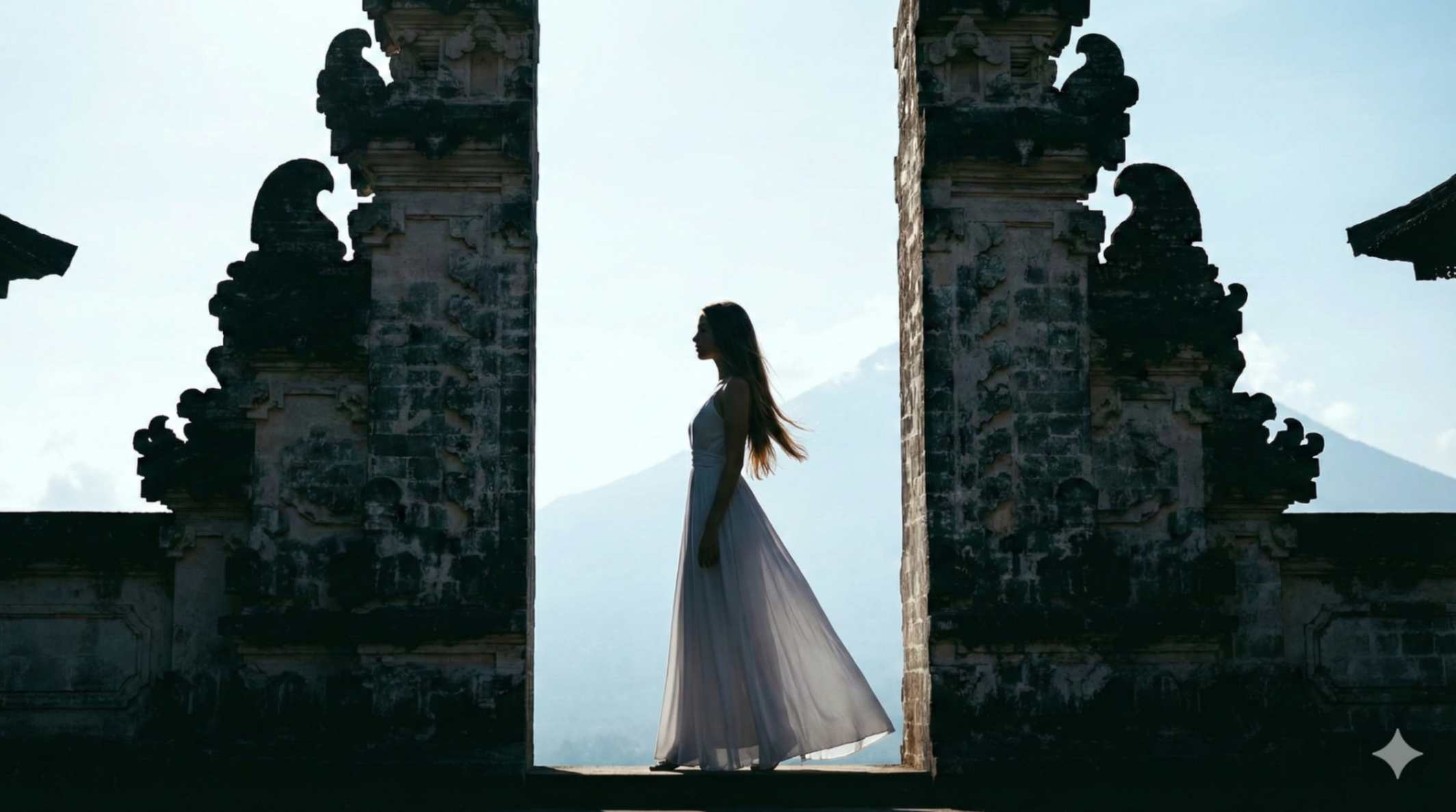 A dramatic silhouette travel photograph of a woman standing between the Gate of Heaven at Lempuyang Temple, Bali. She is wearing the same white fl owing maxi dress, loose hair creating a clean silhouette. Pose: standing still, body straight, balanced posture. Background: bright sky behind the gates creating strong contrast, mountains faintly visible. Lighting: strong backlight forming a soft silhouette while preserving dress shape. Shot wide, mystical and cinematic mood. Ultra-realistic photography, fi lm-style color grading. Use reference image to keep the woman’s face identical.