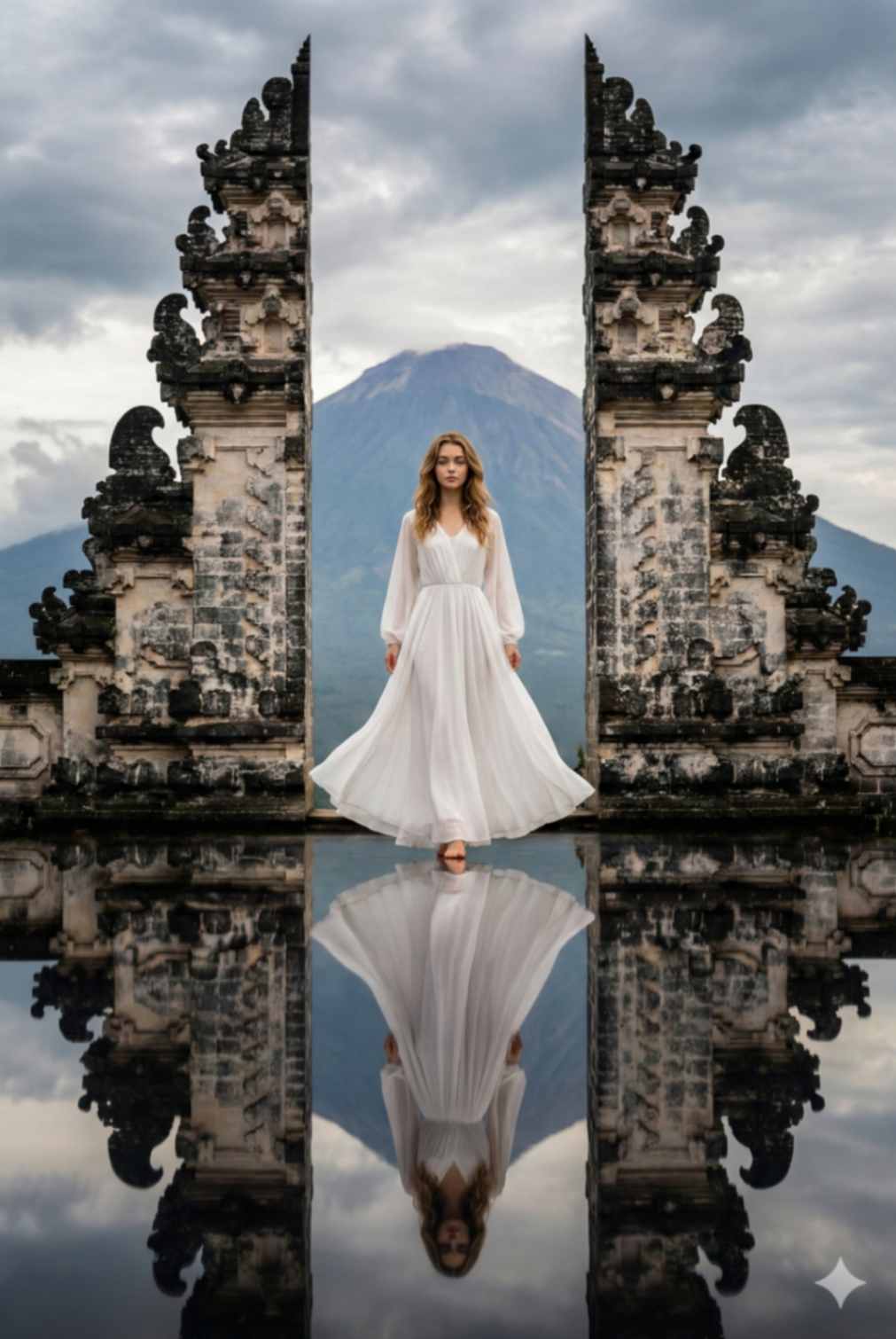 A realistic luxury travel photograph of a woman standing centered at the Gate of Heaven at Lempuyang Temple, Bali, with a perfect mirror refl ection effect beneath her. She is wearing a pure white fl owing maxi dress with long loose sleeves, soft airy fabric, loose wavy hair, natural glowing makeup. Pose: standing still, body straight, arms relaxed, calm spiritual expression. Background: iconic split stone gates, Mount Agung visible between the gates, dramatic sky. Shot straight-on, perfectly centered symmetry, iconic viral Bali aesthetic. Ultra-realistic photography, sharp details, cinematic tones. Use reference image to keep the woman’s face exactly the same.