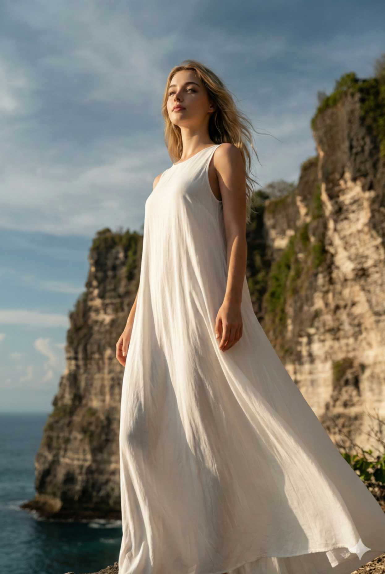 A dynamic fashion-style travel photograph of a woman at Uluwatu Temple, Bali. She is wearing the same white sleeveless fl owing maxi dress, fabric moving dramatically in the ocean wind, loose wavy hair. Pose: standing sideways, one foot slightly forward, allowing the dress to fl ow naturally. Background: ocean cliffs and open sky. Shot wide, capturing motion in the dress, fashion editorial travel vibe. Ultra-realistic, high-speed photography look, crisp details. Face must remain identical using the reference image.