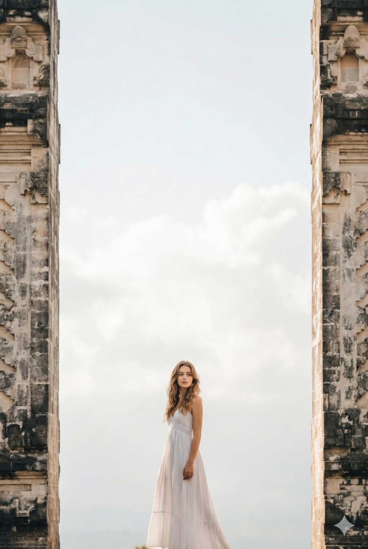 A minimal cinematic travel poster-style photograph of a woman standing slightly off-center between the Gate of Heaven at Lempuyang Temple, Bali. She is wearing the same white fl owing maxi dress, loose waves, glowing natural makeup. Pose: standing still, composed posture, eyes gazing into the distance. Background: clean stone gates with large negative space, sky dominating the frame. Shot wide, minimalist composition, premium spiritual travel aesthetic. Ultra-realistic photography, soft color grading. Use reference image to keep facial identity exactly the same.