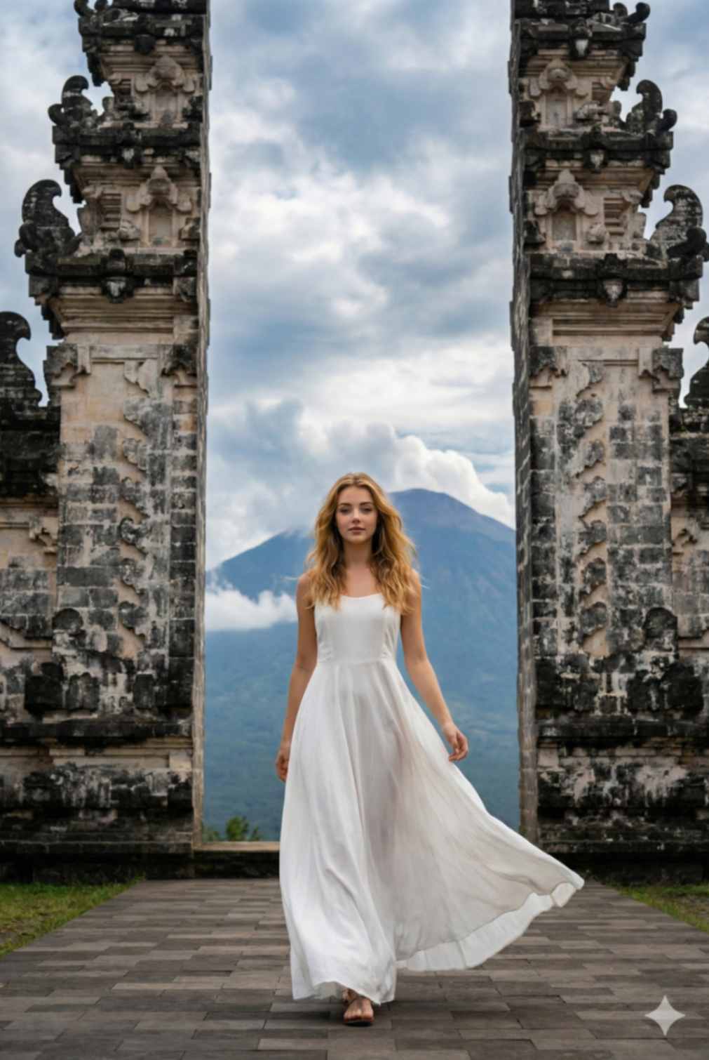 A cinematic travel photograph of a woman walking slowly through the Gate of Heaven at Lempuyang Temple, Bali. She is wearing the same white fl owing maxi dress, fabric moving gently with her steps, loose natural hair. Pose: mid-step walking toward the camera, relaxed shoulders, calm confi dent expression. Background: tall stone gates framing her path, open sky and mountains beyond. Shot centered, eye-level, natural motion captured in the dress. Ultra-realistic photography, luxury travel aesthetic. Use reference image to keep facial identity identical.