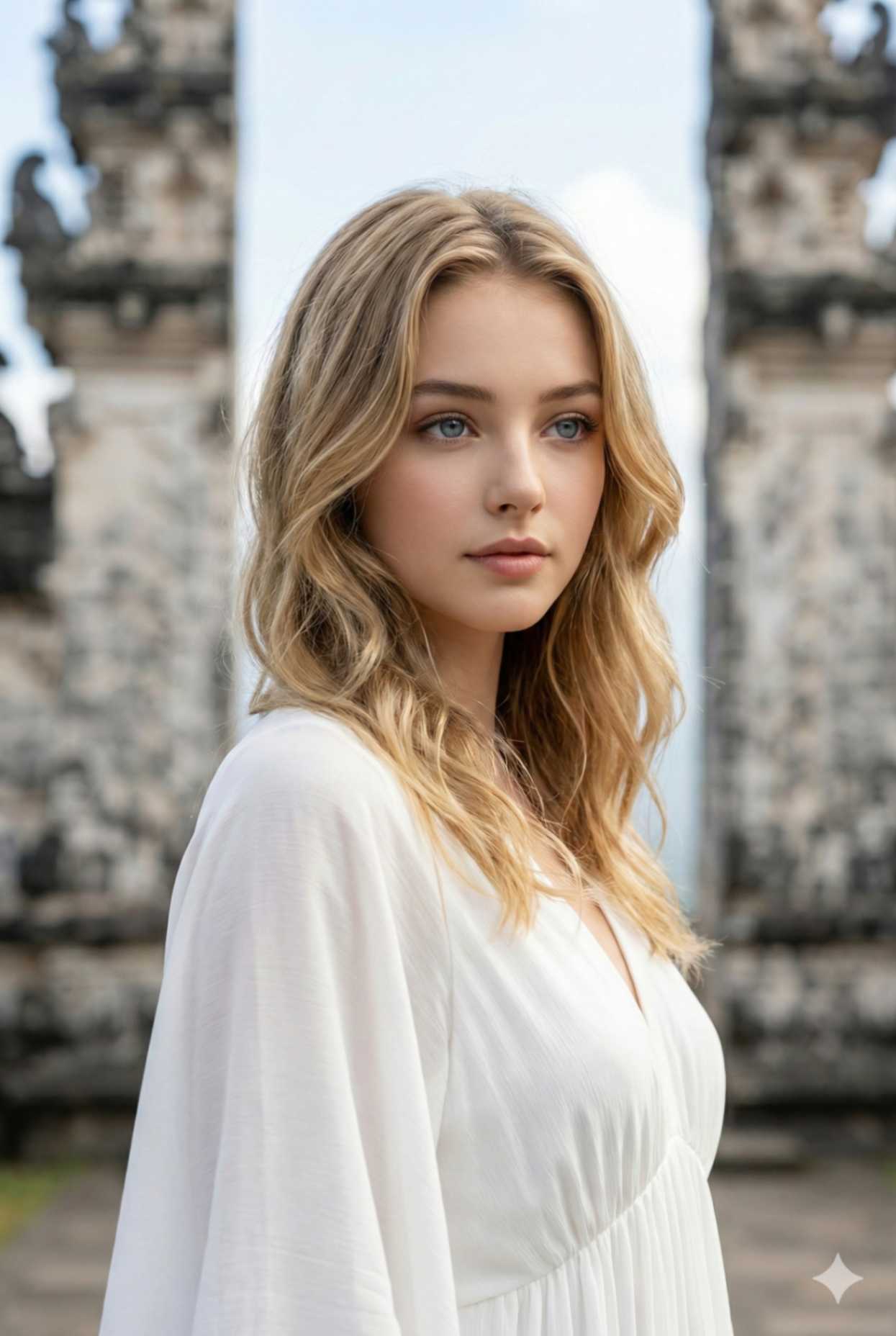 A realistic close-up luxury travel portrait of a woman at Lempuyang Temple, Bali. She is wearing the same white fl owing maxi dress, loose waves framing her face, soft natural makeup. Pose: head slightly turned, eyes looking away from the camera, calm confi dent expression. Background: softly blurred sky and stone gate textures, natural daylight. Shot in portrait mode, shallow depth of fi eld, high-end infl uencer aesthetic. Ultra-detailed skin texture, realistic lighting. Use reference image to keep the woman’s face exactly the same.
