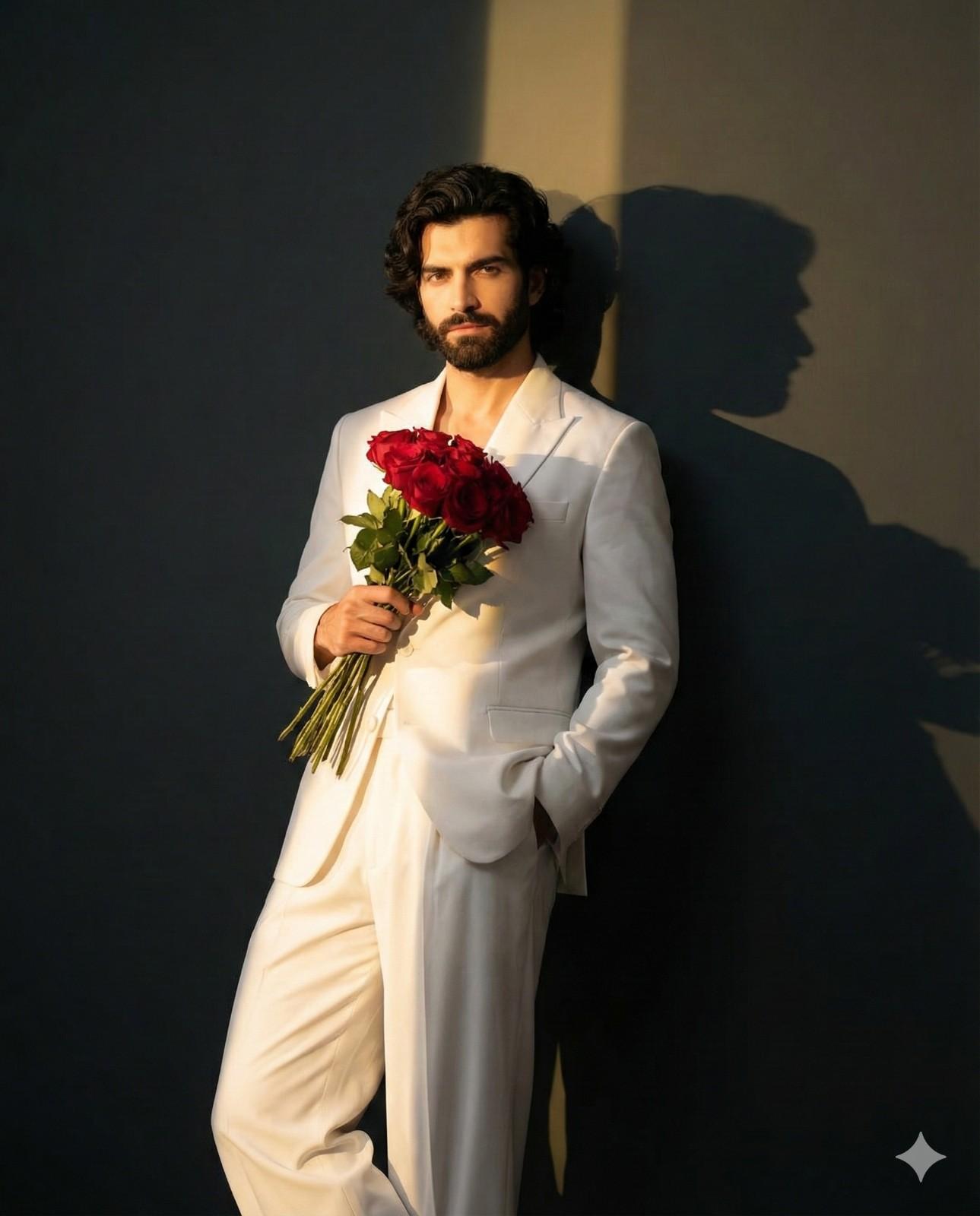 Create an ultra-realistic, high-resolution cinematic portrait using the exact face and hairstyle from my uploaded reference photo (do not change facial structure, skin tone, or hair shape). The person is a young man leaning slightly back against a dark minimalist wall. Use consistent cinematic lighting: a single bold golden sunlight beam cutting diagonally across the frame, illuminating his face and white suit, while the rest of the background remains in deep shadow. He is wearing a pristine, perfectly tailored white suit (structured blazer + wide-leg trousers). One hand casually in his pocket, the other holding a bouquet of deep red roses close to his chest. His expression remains identical to the natural look in my reference photo: eyes open, confident, direct gaze. Keep natural skin texture, clean sharp details, no distortions. Hair must stay exactly like the reference — same style, volume, and shape. A strong oversized shadow silhouette appears behind him on the wall, enhancing depth and drama. Atmosphere must remain constant: romantic, editorial, cinematic, with sharp highlights, rich shadows, clean edges, and painterly light consistency. Maintain the same character identity 100%.
