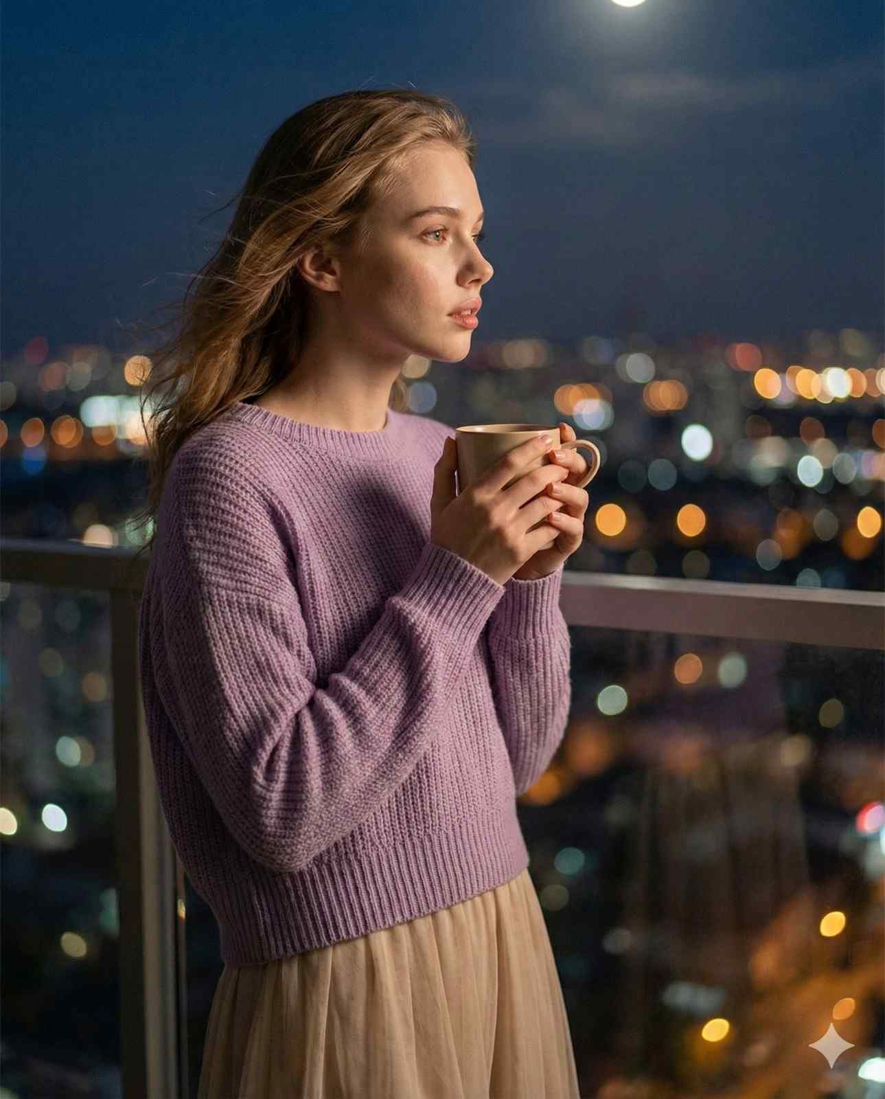 A beautiful woman(use the uploaded image reference the face) stands on a softly lit high-rise balcony overlooking blurred city lights, wearing a lavender knit sweater and a light beige flowing skirt. A gentle night breeze moves her hair as she holds a warm cup close to her chest, lost in introspective emotion. Her expression mixes vulnerability and quiet hope, echoing a romantic Korean-drama tone. Warm bokeh highlights surround her as soft moonlight contours her face.