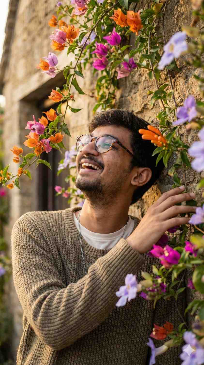 (use the first uploaded image reference the face) Hyper-realistic overhead 9:16 closeup of myself with glasses, playfully leaning against an ivy-covered stone wall of an old countryside cottage during golden hour. I'm laughing with my head slightly tilted back, one hand brushing away a dangling vine, wearing a textured earth-tone knit sweater layered over a soft white t-shirt. The flowering vines are in full bloom with orange, magenta, and lavender hues, softly blurred in the foreground.