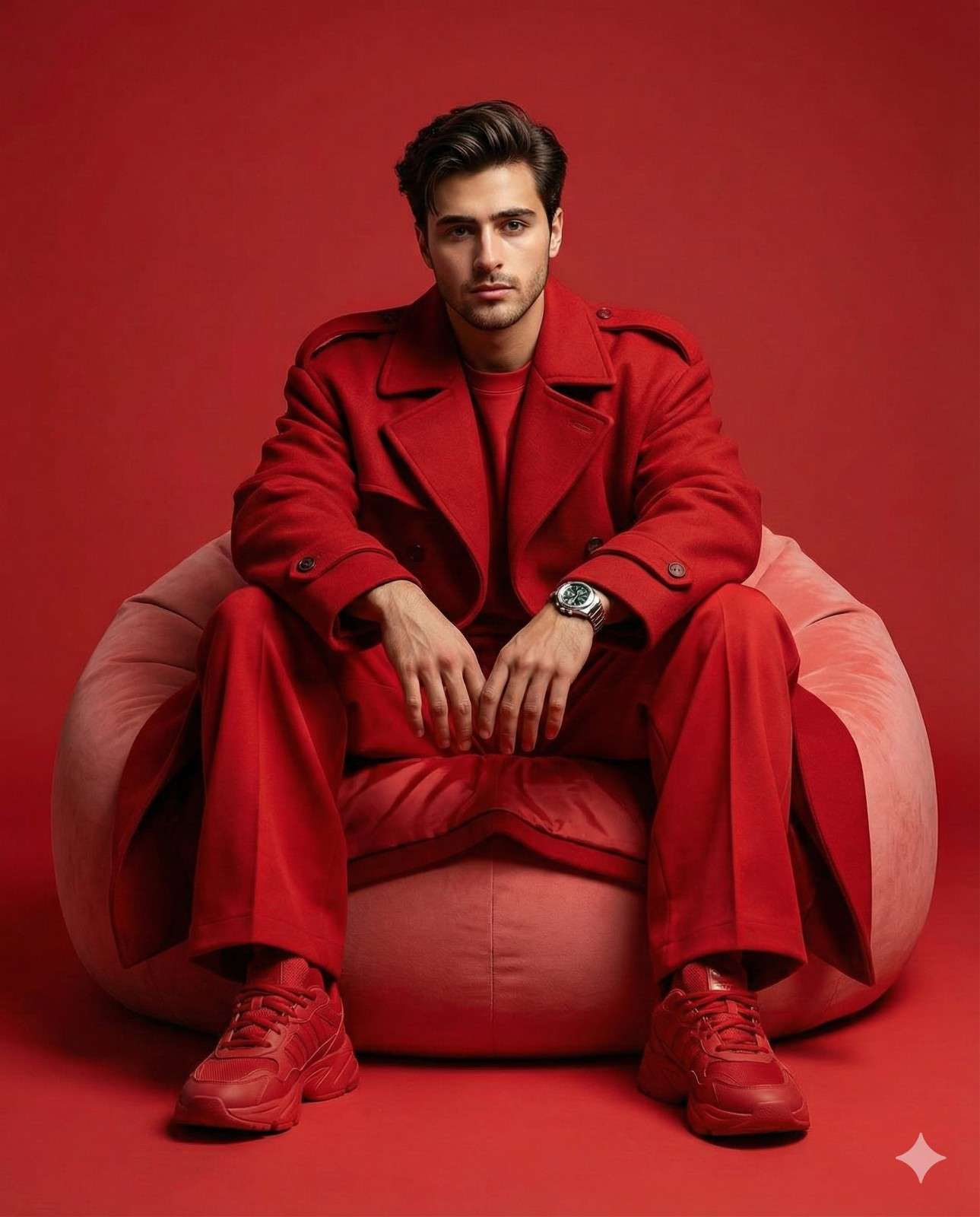 Hyper-realistic cinematic fashion photoshoot of the uploaded person. Seated on a deep light red bean bag, he wears bold all-red oversized streetwear: trench coat, wide red pants, chunky sneakers, silver watch. Solid red background,. Powerful drip vibes, Adidas campaign editorial look, dramatic studio lighting. Keep my face exactly the same as the uploaded photo. Do not change or edit my face.