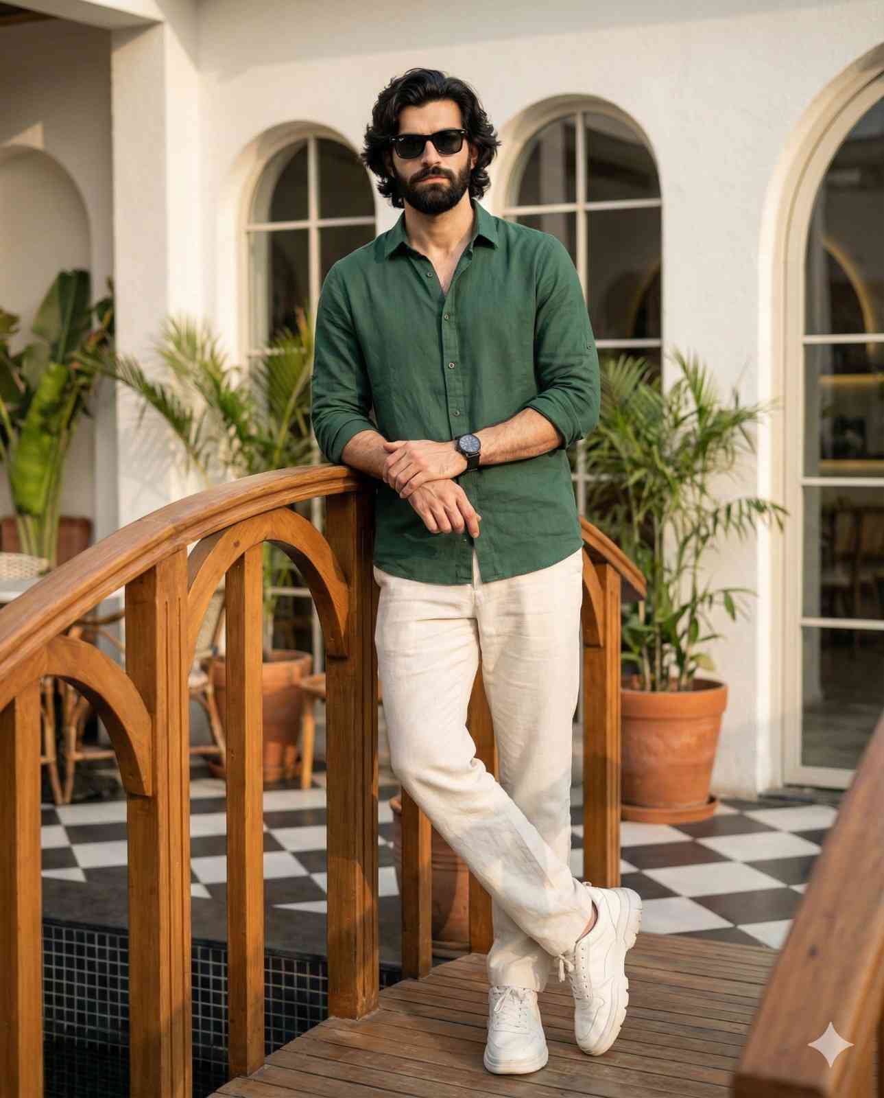 8k, ultra-realistic full-body portrait of a slim (5'7) with same face features from reference (nose, eyes, cheeks, eyebrows (use the first uploaded image reference the face)). he stands relaxed leaning on a wooden arched bridge railing with one leg crossed. outfit: green rolled-sleeve shirt, cream trousers. chunky white sneakers. accessories: black wristwatch, black sunglasses. background: modern mediterranean outdoor café with white walls, arched windows, indoor plants, checkered flooring, warm daylight, cinematic depth, do not change or edit my face.