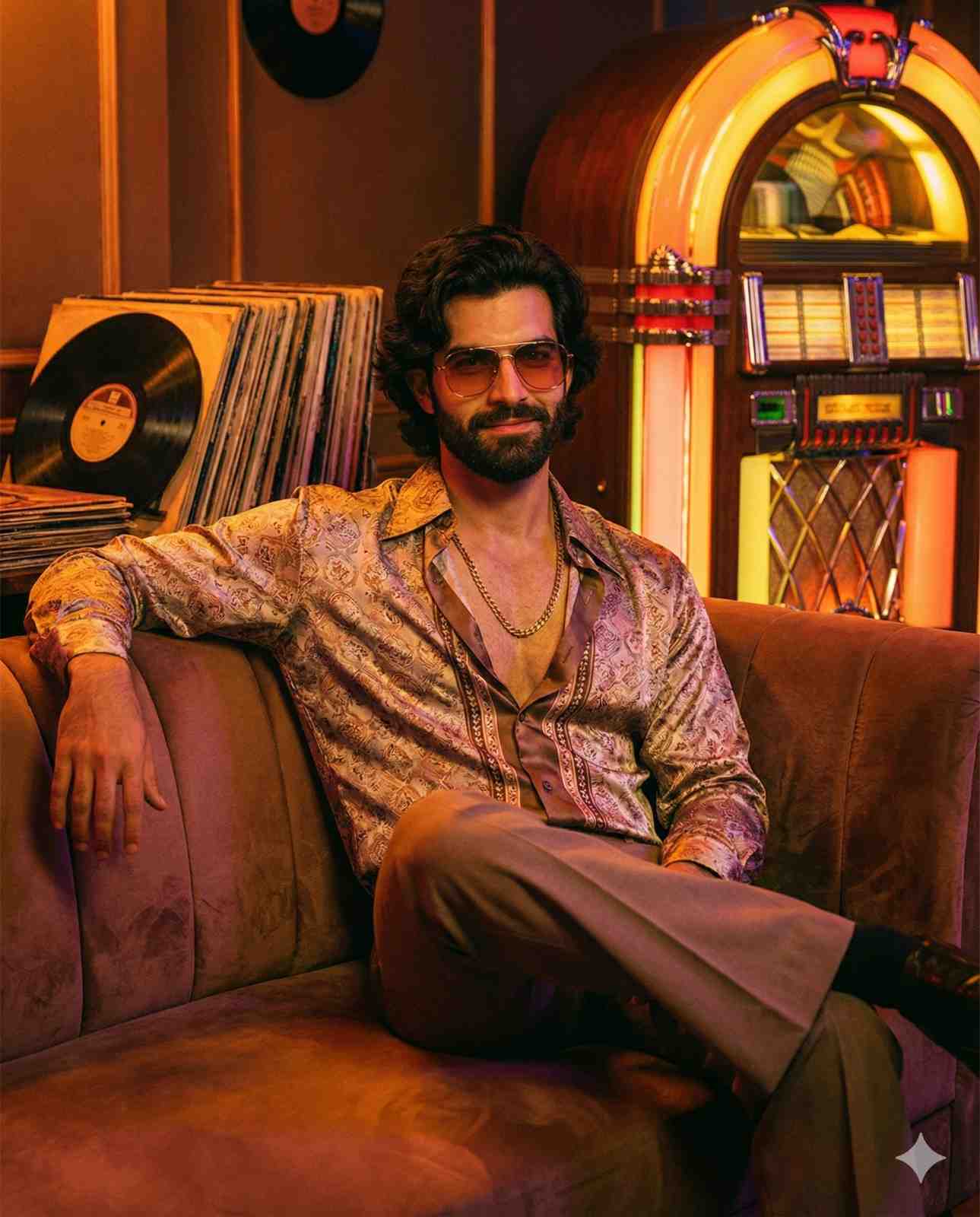 Hyperrealistic portrait of the person uploaded, stylized as a 70s retro icon. He is sitting casually in a dimly lit lounge, with vintage vinyl records stacked behind him and a glowing jukebox casting a warm neon light over the scene. Attire: open-collar printed silk shirt, flared trousers, gold chain, and aviator sunglasses with tinted lenses. The lighting is a warm amber with a subtle film grain, evoking the atmosphere of old Bollywood jazz clubs. The pose is relaxed, with one arm resting on a velvet sofa and a confident half-smile. Keep the face 100% real.