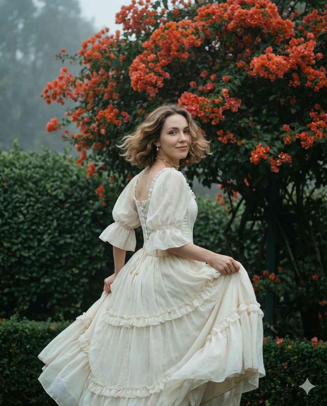 High-fashion cinematic image using the exact same face from the uploaded reference photo, preserved with absolute identity fidelity. The face must remain completely unchanged in facial structure, proportions, age, skin tone, texture, makeup style, expression, emotion, and gaze. No beautification, no age change, no skin tone change, no hairstyle change that alters the face. Identity must be a perfect one-to-one match with the reference photo. Hair: Keep the exact same hairline, hair length, texture, and color as in the reference photo. Hair may be naturally affected by wind for realism, but must not be shortened, restyled into a bob, or altered in a way that changes identity. Body: Natural, realistic body proportions consistent with the reference subject. No extreme slimming or exaggeration. Pose & Motion: The subject is captured in motion outdoors. Her back is initially facing the camera as she appears to be running away, then she turns her head over her shoulder to look directly at the camera. Both arms are extended outward, lifting the sides of her skirt as it flows dynamically. Elegant, cinematic movement frozen in time. Outfit (Coquette / Victorian Goth aesthetic): An ivory or off-white full-length ball gown with dramatic volume. Neckline: Low square neckline with lace or ruffle trim. Bodice: Structured corset-style bodice with visible vertical boning lines. Sleeves: Voluminous bishop or puff sleeves made of sheer chiffon or tulle, tied delicately at the wrists. Skirt: Extremely wide, layered skirt with multiple ruffled tiers for dramatic movement. Details: Delicate lace accents along seams and hem for a luxurious vintage feel. Fabric appears as soft cotton poplin for structure, sheer chiffon or tulle for sleeves, and brocade lace detailing. Accessories: Small round white pearl earrings and a thin gold chain choker necklace. Background & Atmosphere: A lush outdoor garden setting with dense green foliage. A large bougainvillea tree with vivid orange-reddish flowers dominates the background, creating strong contrast against the greenery. Leaves are broad, layered, and hedge-like. The air appears misty and dewy, evoking a cool, calm, emotional mood. Camera & Composition: Eye-level angle, centered composition. Medium-long shot capturing the full body and most of the environment. Color & Cinematic Style: Earth tones and soft pastels dominate—deep greens, ivory whites, warm cream and light brown accents. Soft, diffused lighting with a dreamy mist effect near the top of the frame. Low contrast, vintage film aesthetic with a timeless, cinematic mood. Critical Rule: The face must remain exactly identical to the uploaded reference photo with zero modification. Identity consistency is mandatory.