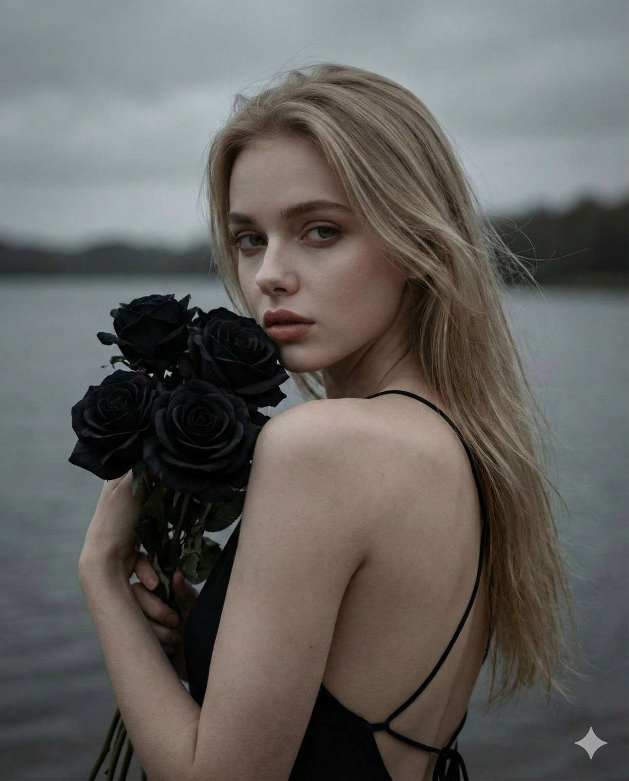 Create a cinematic portrait based on the provided reference photo, keeping her face completely unchanged (1000% identical in all facial details, proportions, and expression). A woman with smooth, pale skin stands with her back to the camera, turning her head over her shoulder with a soft, melancholic, and intense gaze. Her long, straight hair is slightly tousled by the wind. She holds a bouquet of black roses close to her face. a.n.d.r.y.69 She is wearing a black backless top with delicate straps that drape down her back. Background: A moody lakeside or riverside scene under overcast grey skies. Lighting & Mood: Soft lighting, desaturated color grading, gothic, melancholic, atmospheric.