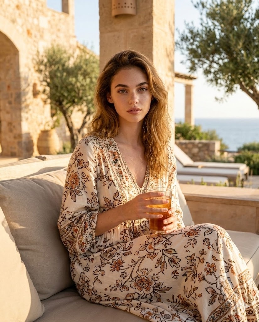A cinematic evening lifestyle portrait of a young woman with very fair, smooth skin and delicate facial features, sitting gracefully on a soft light-green outdoor sofa at a stylish terrace café or lounge. She has long, voluminous dark brown hair styled in loose flowing waves that cascade over her shoulders and down her back. Her face is elegant and refined with large expressive eyes, softly arched brows, a small nose, and natural pink lips, giving her a calm yet slightly captivating expression as she looks directly toward the camera. Use this uploaded photo as the only and exact face reference. The generated image must use this same face exactly as shown, without any changes to identity, facial structure, or expression. Her posture is relaxed and poised, sitting sideways on the sofa with one leg bent and tucked close to her body while her hands gently rest around her knee, creating a soft and graceful pose. She is wearing a flowing cream-colored maxi dress with thin straps and a delicate pleated texture, decorated with soft watercolor-style floral prints in shades of pink, red, yellow, and green. The lightweight fabric drapes elegantly around her legs, catching subtle folds and movement that enhance the romantic aesthetic. She is barefoot, adding a relaxed, natural feel to the scene, and wears delicate accessories including small drop earrings and a slim bracelet watch on her wrist. The environment around her is an elegant outdoor terrace surrounded by lush greenery and manicured bushes. Behind her are beautiful classic-style building facades with textured stone walls, arches, and balconies that add a European-inspired architectural atmosphere. The scene takes place during early evening or dusk, with soft ambient lighting from nearby buildings and streetlights creating a warm glow in the background while the subject is illuminated by a soft camera flash that highlights her skin and dress. The color palette blends natural greens, warm architectural tones, and the pastel colors of her floral dress. The composition is balanced and editorial, with the woman as the clear focal point against the softly blurred city background, creating a luxurious lifestyle photography aesthetic with crisp detail, natural depth, and a calm, romantic evening mood.