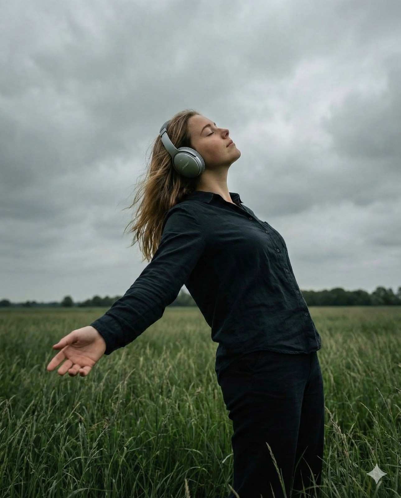 A cinematic, moody photograph of a (use the uploaded image reference the face). standing in a lush green field of tall grass under a cloudy, overcast sky. SHe is wearing a loose, dark button-up shirt and dark trousers. His posture is expressive and dramatic, leaning slightly backward with one arm outstretched and palm open, as if embracing the wind or the moment. His head is tilted back, eyes closed, and she is wearing large, over-ear silver headphones, giving a sense of calm and emotional release. The perspective is slightly low-a.