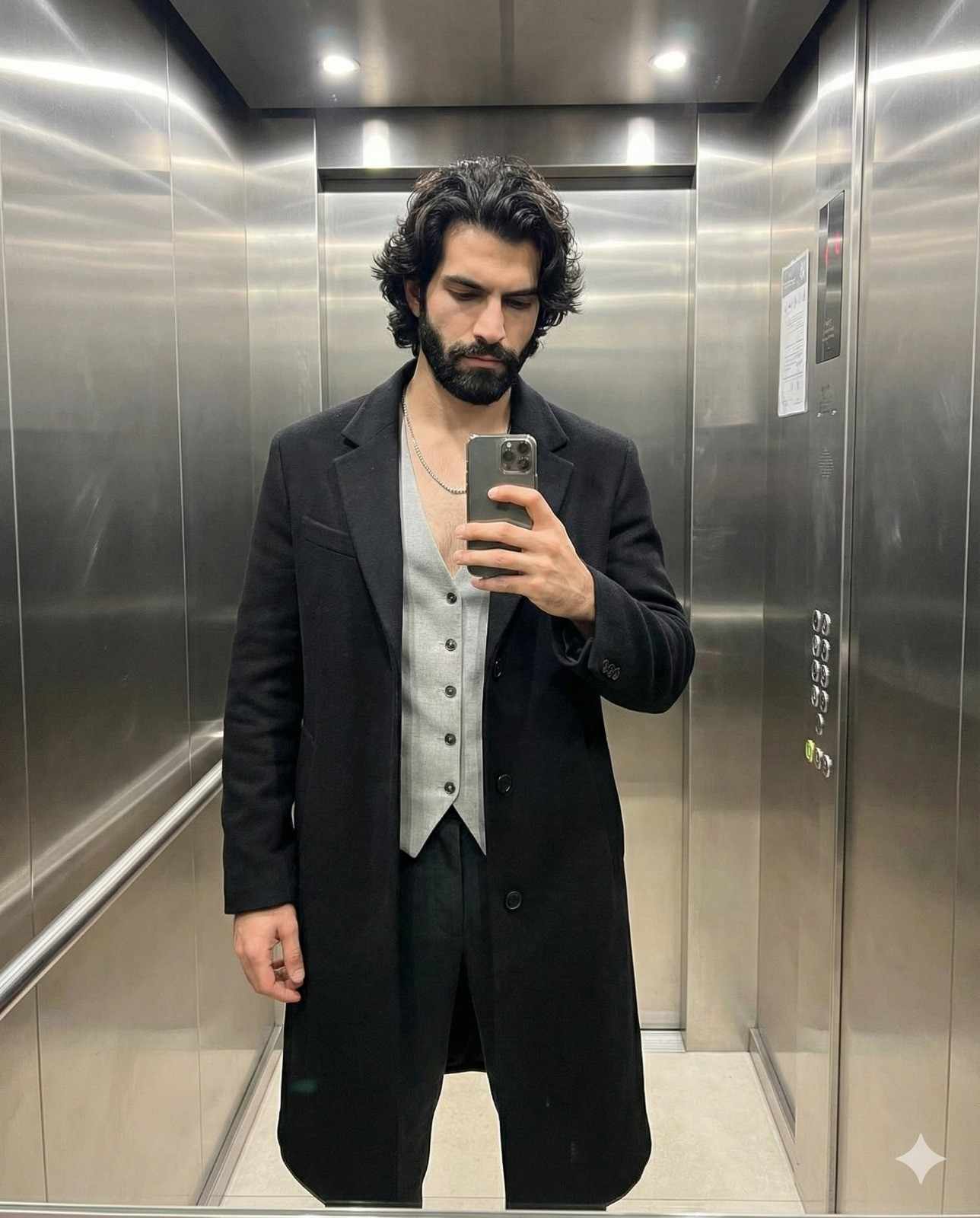 A realistic, cinematic mirror selfie portrait of a adult man(use the uploaded image reference the face) standing inside a modern stainless-steel elevator, captured with a calm, moody, fashion-editorial aesthetic; he has a lean, athletic build, light-to-medium warm skin tone, a sharp jawline with subtle natural stubble, defined cheekbones, and deep-set dark brown eyes looking slightly downward at his phone screen with a serious, composed, introspective expression; his lips are relaxed and neutral, conveying quiet confidence; his hair is thick, dark brown, medium length, and naturally wavy, styled in a slightly tousled, effortless way with loose curls framing his forehead; he is wearing a long black overcoat with a structured yet relaxed fit, worn open over a light grey scoop-neck inner vest, paired with dark trousers and a black belt, creating a sleek monochrome look with subtle contrast; a thin silver chain necklace is faintly visible at his neckline; he holds a modern smartphone in one hand at chest height, partially covering his torso, while his other arm hangs naturally by his side; the elevator interior features smooth metallic walls, clean vertical lines, and a minimalist design with soft reflections, adding depth and symmetry to the composition; lighting is soft, diffused, and evenly spread from overhead elevator lights, gently highlighting his facial structure, hair texture, and coat without harsh shadows; the color palette is neutral and muted, dominated by greys, blacks, and soft metallic tones, enhancing the modern, understated mood; the overall atmosphere is calm, stylish, introspective, and cinematic, with high realism and a candid lifestyle photography feel. Use this uploaded photo as the only and exact face reference. The generated image must use this same face exactly as shown, without any changes to identity, facial structure, or expression.