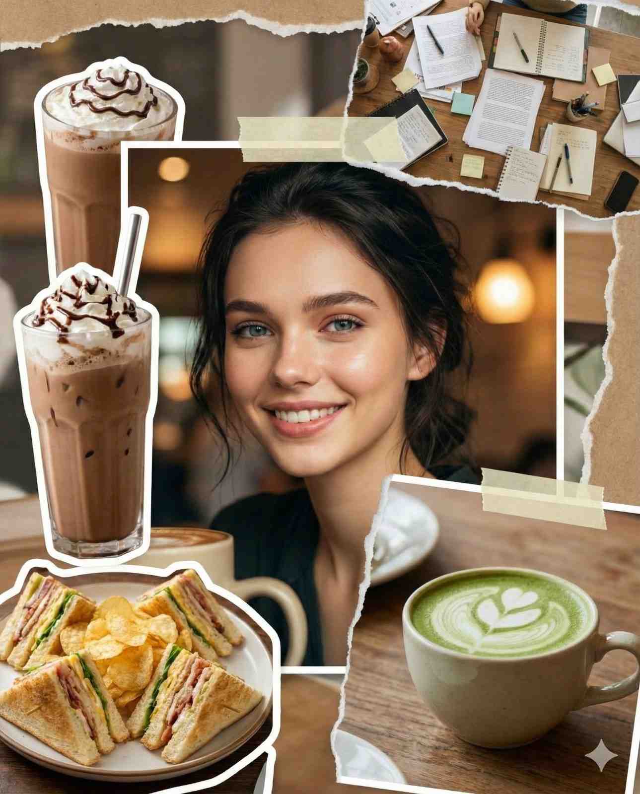 A vibrant digital photo collage of a lifestyle café scene using the exact same face from the uploaded reference photo, with absolute identity lock. The woman’s face must remain 100% identical to the reference—no changes to facial structure, proportions, features, skin tone, texture, age, expression, or emotion. Preserve all identity-defining details precisely. Central image: the subject (using the unchanged reference face) sits at a café table, smiling naturally. She has dark hair styled casually. Cozy, warm café lighting flatters the scene without altering facial identity. Surrounding overlapping cut-out images (scrapbook style): A tall iced mocha topped with whipped cream A plate of sandwiches served with potato chips A cup of green matcha latte A top-down view of a cluttered café table with papers, notebooks, and pens The collage aesthetic is Gen-Z social media scrapbook: layered paper edges, subtle drop shadows, tape or sticker accents, playful overlap, and a casual, cozy vibe. Color grading is war