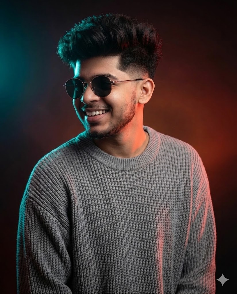 A high-quality realistic portrait of a young man with voluminous hair with fade haircut, sunglasses. He is wearing a grey, oversized ribbed knit sweater. He is smiling and looking away from the camera. The lighting is dramatic and moody, featuring a strong teal/blue rim light outlining his hair and shoulders, with warm red and orange ambient glows in the dark background. Sharp focus, professional studio photography, 8k resolution, depth of field.