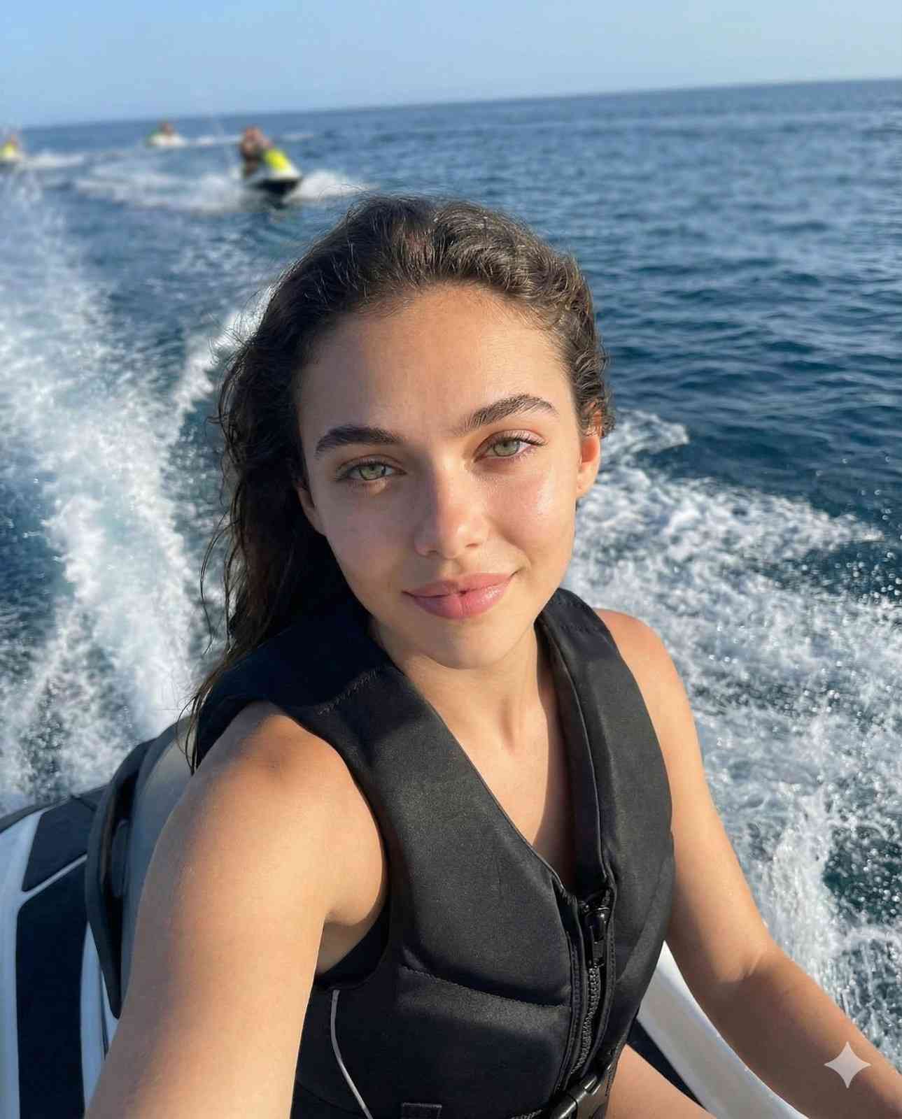 Create a highly realistic, vibrant, photorealistic action portrait using the attached reference image with absolute identity lock. The woman’s face must be identical to the reference image with no changes whatsoever. Preserve 100% fidelity to her facial features, facial structure, bone structure, skin tone, skin texture, pores, facial proportions, eye shape, nose, lips, jawline, hair type, hairline, and all identity-defining details. Do not alter age, expression, symmetry, or emotion. No beautification or stylization. Depict the same woman riding a jet ski, captured at a selfie angle, with head and chest visible, sharp focus on her face and upper body. Her expression should be natural, relaxed, and adventurous, exactly consistent with the reference face. She has dark natural hair (not long, no extensions), no sunglasses, and is wearing a black life jacket. Set the scene in the open ocean with a slightly rippled water surface under a clear blue sky in bright natural daylight. Use clean, realistic lighting with natural highlights on skin and water. Add a subtle sense of motion from riding the jet ski. Include other people riding jet skis in the distance, softly blurred to create depth and motion, with no extra people in the foreground. Maintain high clarity and sharpness, natural color accuracy with no artificial tones, and an overall lively, energetic, fresh, fun, and dynamic atmosphere. Strictly avoid: any face alteration, blurry face, distorted proportions, unrealistic lighting, deformed hands, incorrect facial structure, incorrect accessories, disfigured body, extra foreground subjects, cartoon or painting styles, artificial colors, low quality, watermarks, text, and long hair.