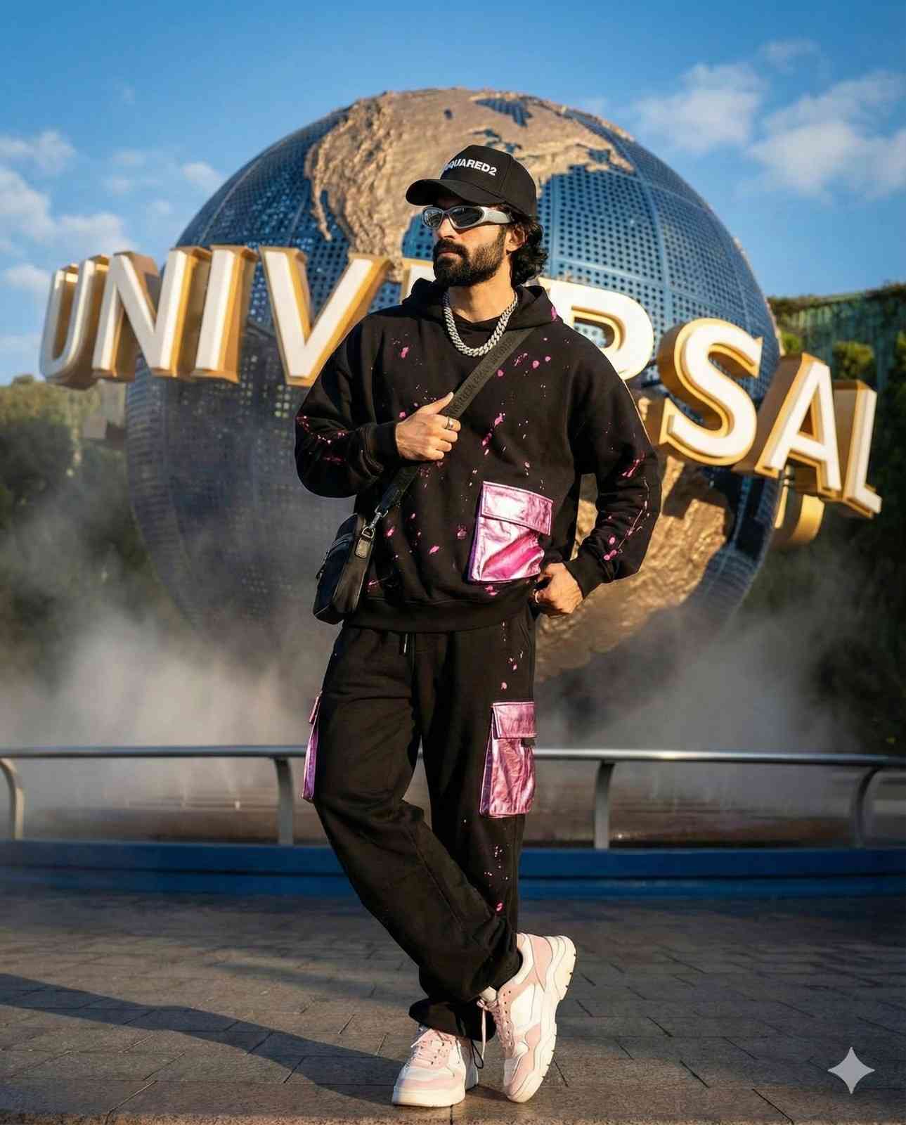 Ultra-realistic cinematic full-body portrait of the same man (keep his face exactly the same as the reference) standing in front of the giant metallic UNIVERSAL globe with mist and glowing golden letters. He strikes a modern high-fashion pose one leg slightly bent, one hand holding the strap of his crossbody bag, the other on his hip - with a confident, thoughtful expression. Wearing a black Dsquared2 cap, oversized black hoodie with pink paint splatters and metallic pink cargo pockets, matching loose cargo pants, chunky white and pale pink sneakers, silver Cuban chain, and futuristic sunglasses. Golden hour lighting with strong direct flash, cinematic shadows, low-angle editorial composition, blurred background, deep blue sky with scattered clouds, realistic textures and high contrast.