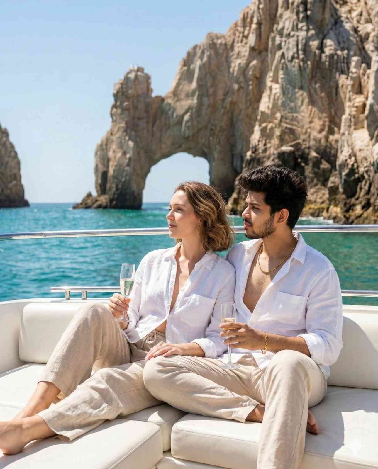 A couple(use the uploaded image reference the face), sitting on a yacht, wearing an unbuttoned white linen shirt and beige pants, holding a flute of champagne. Hey are looking off into the distance. In the background, clear turquoise water and a large natural rock arch formation (like El Arco in Cabo San Lucas) under a bright sunny sky. Golden chain necklace and bracelet details. Cinematic, high-quality photograph, shallow depth of field.