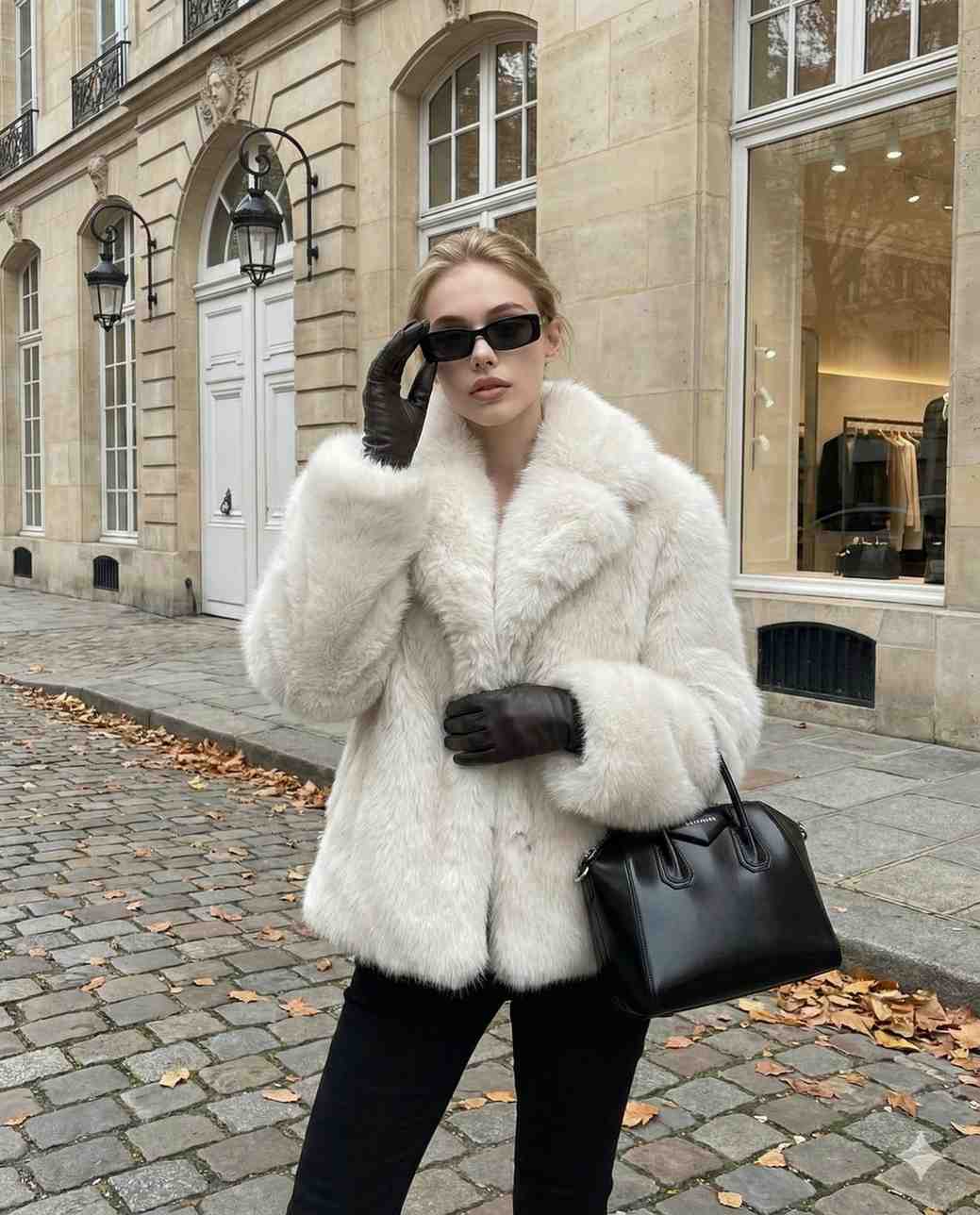 Create a hyper-realistic photograph of a woman(use the uploaded image reference the face) standing on the street in an elegant European city. She wears a luxurious white damaeva faux fur coat with a soft, fluffy texture and broad shoulders. She wears skinny black pants and fitted dark gloves. She holds a black designer handbag with visible handles and a polished finish. She wears small rectangular black sunglasses, slightly pushed up the bridge of her nose, and touches them with a gloved hand, creating an impression of confidence and elegance. Her makeup is softly glamorous, with defined lips, clear skin, and subtle contouring. In the background is the classic damaeva European building's beige stone facade with tall arched windows, white wooden doors, and black wall lanterns. One of the windows reveals the interior of a boutique with warm lighting and mannequins in luxurious clothing. A small orb with a topiary haircut stands by the door. The street below is decorated with pedestrian lanes, fallen autumn leaves, and a muted, slightly overcast daylight. The lighting is soft, natural, and slightly diffused, creating balanced shadows and subtle contrast. The colors are neutral, elegant, and cool, with an emphasis on white, beige, and black. The framing is medium-shot, centered on the woman, encompassing her from head to mid-thigh. The composition should be editorial, sophisticated, and fashionable. Ultra-realistic photography, detail, natural skin texture, luxurious aesthetics, and a cinematic effect.