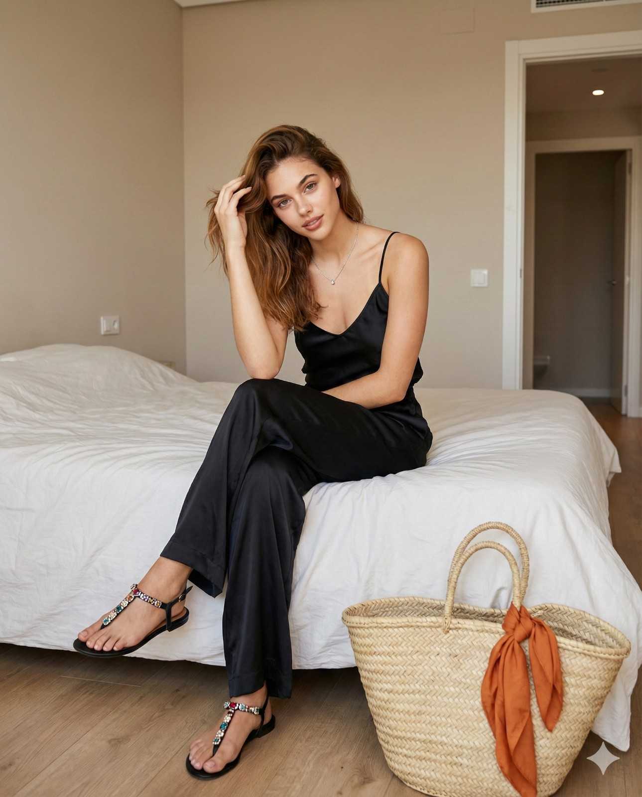 Create a candid, photorealistic 8K lifestyle photograph using the uploaded reference image with absolute identity lock. The woman’s face must be an exact, unchanged match to the reference image. Preserve 100% fidelity to her facial features, facial structure, bone structure, proportions, natural skin tone, skin texture, pores, micro-details, eye shape, nose, lips, jawline, makeup style, hairstyle, and overall physiognomy. No beautification, no facial reshaping, no symmetry correction, no age shift, no smoothing filters. Identity must remain perfectly unchanged. Depict the same young woman seated relaxed on a bed in a modern minimalist bedroom or hotel room. She sits with her legs bent or crossed, conveying an effortless, natural posture. Her pose includes: One hand casually running through her hair Looking directly at the camera Her expression is warm, confident, relaxed, and radiant, fully consistent with the reference face. Her long, straight brunette hair remains unchanged from the reference, with natural fall and realistic texture. Makeup is natural and subtle, enhancing realism without altering identity. Wardrobe & accessories: A black satin two-piece loungewear set: Spaghetti-strap camisole top Loose silk trousers A delicate silver necklace Black flat sandals with multi-colored rhinestone jewel–embellished T-straps All clothing must fit naturally and realistically without altering body proportions. Environment: Softly wrinkled white bed sheets Beige walls Wooden flooring A woven straw market bag on the floor with an orange scarf draping out A visible doorway in the background Lighting & style: Soft natural daylight combined with bright interior lighting No harsh shadows or dramatic contrast Smooth, realistic skin tones Sharp focus on the subject Gentle depth of field for subtle background separation Visual aesthetic: Influencer-style lifestyle photography Relaxed, elegant, modern High-resolution, ultra-realistic Clean, natural, unedited feel Strictly avoid: any facial or hair alteration, identity drift, artificial skin smoothing, exaggerated beauty effects, distorted anatomy, harsh or cinematic lighting, stylized or painterly looks, blur on the face, low resolution, noise, artifacts, watermarks, logos, or text.