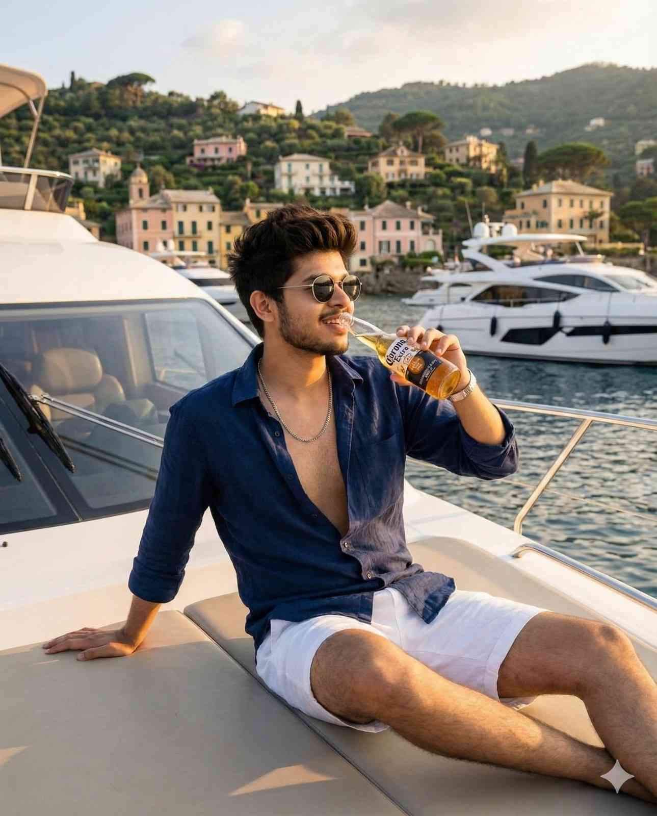 Ultra-realistic cinematic photo of a stylish young man sitting relaxed on a luxury yacht at sunset. He wears an open navy blue linen shirt, white shorts, dark sunglasses, and a silver chain. He is confidently drinking a Corona beer while enjoying the moment. Behind him, a beautiful Mediterranean coastline with luxury yachts, pastel-colored houses on green hills, and golden sunlight reflecting on the water. Warm summer atmosphere, soft natural lighting, high-quality lifestyle photography, resolution, color harmony in blue, gold, and white tones.