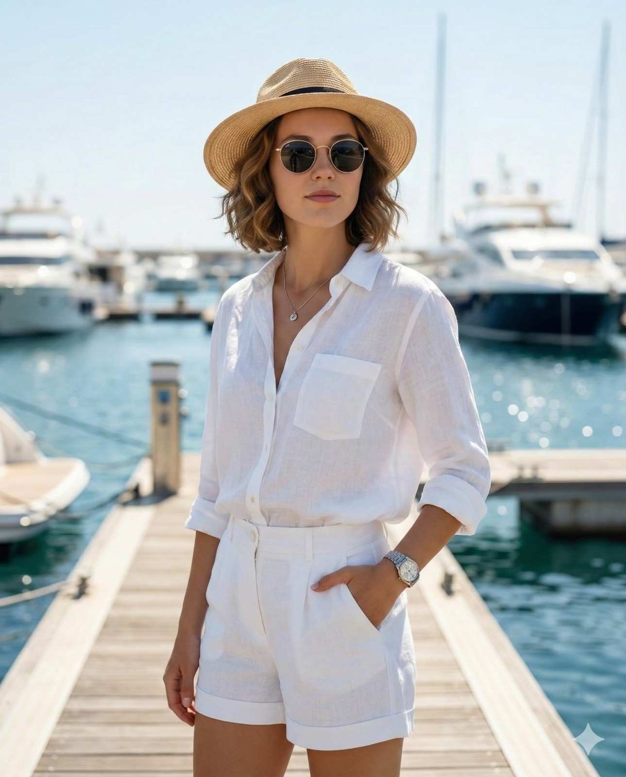 Create a high-fashion editorial, luxury lifestyle, ultra-photorealistic image using the attached reference photo with absolute identity lock. The woman’s face and body must be identical to the reference image with no modification of any kind. Preserve 100% fidelity to her facial likeness, facial features, facial structure, bone structure, proportions, skin tone, skin texture, pores, natural imperfections, eye shape, nose, lips, jawline, hair type, hairline, and overall physical characteristics. No beautification, no stylization, no age shift, no symmetry changes, no expression exaggeration. Identity must remain perfectly unchanged. Depict the same woman, a 22-year-old athletic, fit, and stylish female, standing confidently on an exclusive yacht marina pier. Her posture is relaxed yet confident, with one hand casually placed in the pocket of her pristine white summer shorts. Her expression is serene, self-assured, and natural, looking slightly away from the camera, fully consistent with the reference face. Dress her in a light white linen shirt, slightly open at the chest, paired with immaculate white summer shorts. She wears a stylish straw Panama hat, modern round sunglasses, a silver necklace, and a luxury wristwatch. All accessories must appear realistic, correctly scaled, and naturally worn, without obscuring or altering facial identity. Set the scene at a luxury yacht marina, with sparkling blue water in the foreground and a luxury yacht in the background, softly blurred to create depth. The sky is clear and bright. Illuminate the scene with strong natural midday sunlight, producing defined yet realistic contrast, subtle highlights on her physique, and clean, vibrant tones. Capture the image as if shot on a Sony a7R IV with a 50mm f/1.2 GM lens, maintaining ultra-sharp focus on the subject, prestigious creamy bokeh in the background, and professional editorial framing. Apply vibrant, clean color grading emphasizing bright whites and rich blues, rendered in 8K resolution with hyper-realistic detail and ultra-detailed textures, conveying an atmosphere of luxurious leisure, summer elegance, confidence, and high-end fashion. Strictly avoid: any facial or body alteration, identity drift, distorted proportions, unrealistic anatomy, artificial lighting, harsh stylization, cartoon or painterly styles, plastic skin, incorrect accessories, low resolution, blur, noise, artifacts, watermarks, logos, or text.