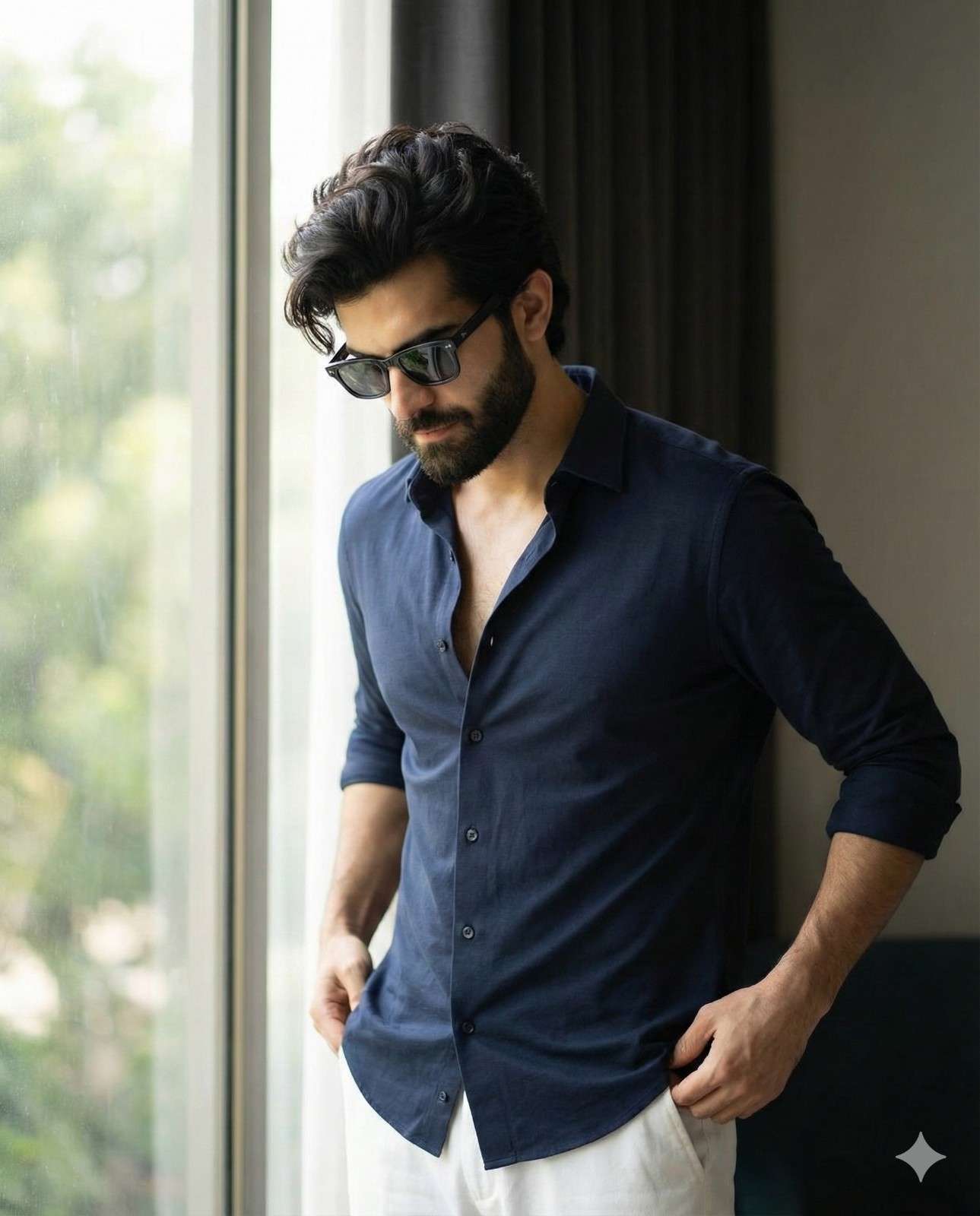 A clean, cinematic indoor portrait of a young man standing near a large glass window in a modern, minimal interior during daytime, illuminated by soft natural daylight streaming in from the left side. He has a sharp, masculine face with a calm, introspective expression, his head slightly tilted downward as he looks toward the floor, giving a composed and stylish mood. His hair is thick, jet black, and styled in a voluminous textured messy quiff with neatly faded sides, adding depth and structure to his look. He has a well-groomed, neatly trimmed beard and mustache that clearly define his jawline and chin. His skin tone is warm medium, evenly lit with gentle highlights from the window light, creating smooth, natural skin texture and subtle shadows along the cheekbones. He is wearing dark rectangular sunglasses that add a modern, confident edge. His outfit consists of a fitted navy-blue button-down shirt worn slightly open at the collar, paired with crisp white trousers, creating a sharp contrast and an elegant, semi-formal aesthetic. His posture is relaxed yet confident, shoulders slightly forward, both hands casually adjusting or resting near his pockets, conveying effortless style. The background features a tall dark curtain on one side and a bright glass window on the other, with soft greenery visible outside, adding balance between light and shadow. The color palette blends deep navy blues, clean whites, and natural greens, producing a refined, stylish atmosphere. The overall mood feels calm, confident, modern, and editorial—like a high-end lifestyle or fashion shoot captured with a DSLR, shallow depth of field, sharp focus on the subject, realistic textures, and professional lighting. Use this uploaded photo as the only and exact face reference. The generated image must use this same face exactly as shown, without any changes to identity, facial structure, or expression.