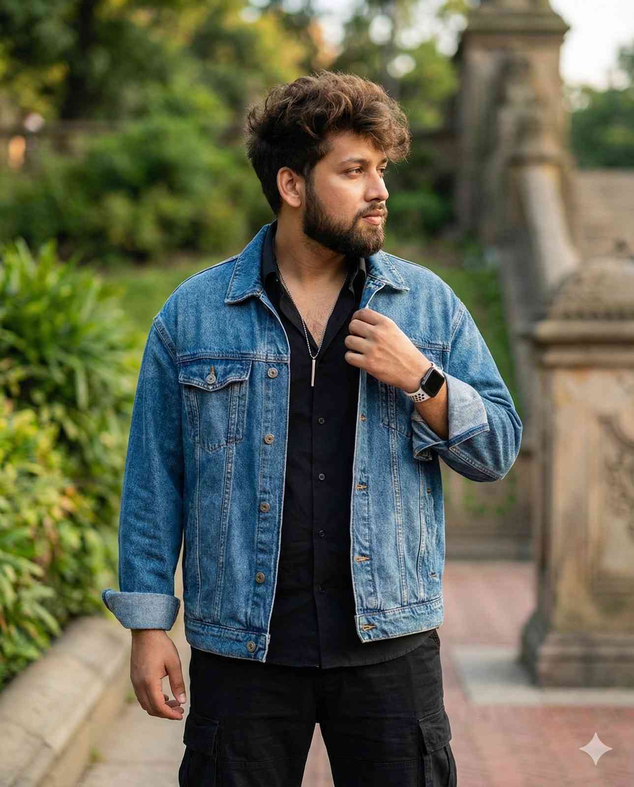 13K ultra-realistic DSLR-quality image using the exact same face from the uploaded reference image with absolute identity preservation — DO NOT CHANGE THE FACE. No alterations to facial structure, proportions, age, expression, skin tone, texture, or any identity-defining features. The face must match the reference perfectly. A stylish young man with identity-consistent messy, voluminous hair (same hairline and density as the reference), posing with a confident, attitude-driven stance outdoors. The right side of the face is the primary focus, cleanly lit and sharply detailed, maintaining perfect facial accuracy. OUTFIT: Oversized denim jacket with realistic heavy fabric texture. Black button-up shirt underneath, clean and structured. Black baggy cargo pants with natural folds and weight. Vertical bar pendant necklace. Black-and-white Apple Watch on the wrist. Subtle, minimal logo detail on the outfit — understated and realistic. POSE & COMPOSITION: Attitude pose with grounded, masculine body language. Hands positioned naturally to show accessories without distraction. Camera framed to emphasize the right side of the face and upper torso. ENVIRONMENT & LIGHTING: Vibrant natural outdoor setting with lush urban vibes. Background softly blurred with a clean black-toned cinematic bokeh (depth-of-field blur only, no stylization). Cinematic natural lighting shaping the subject while preserving realism. Ultra-realistic detail, sharp focus, true skin texture, realistic fabric rendering. Professional fashion photography aesthetic. No filters, no artificial effects — pure high-end DSLR realism.