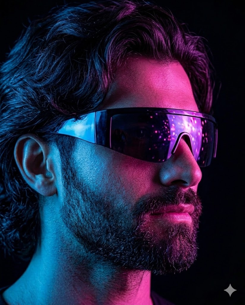 Create a dramatic, ultra-realistic neon-lit side profile portrait of a young man against a completely dark black studio background. Use this uploaded photo as the only and exact face reference. The generated image must use this same face exactly as shown, without any changes to identity, facial structure, or expression. His face is captured in sharp side profile, facing toward the right side of the frame, with a confident and relaxed expression — lips slightly parted, jawline well-defined, and light stubble visible along his chin and upper lip. His skin texture should be highly detailed, with smooth natural complexion enhanced by bold dual-tone lighting. He is wearing large, futuristic reflective visor-style sunglasses that fully cover his eyes, with a glossy surface reflecting scattered pink and purple light particles, adding a cyberpunk aesthetic. His hair is styled upward and slightly voluminous at the front, neatly groomed with subtle texture visible under the colored lights. The lighting is dramatic and cinematic: electric blue light illuminating one side of his face and neck, while vibrant magenta-pink light washes over the other side, creating a strong color contrast and high-definition shadow contouring. The background must remain deep black, allowing the neon colors to pop intensely and create a moody, high-fashion studio vibe. Fine details such as light gradients blending across his cheekbones, subtle shine on the sunglasses, and crisp edge lighting around his silhouette should be clearly visible. The overall atmosphere should feel bold, modern, edgy, and cyberpunk-inspired, with high contrast, ultra-sharp focus, rich saturation, and professional studio quality that emphasizes the neon color interplay and sleek composition.