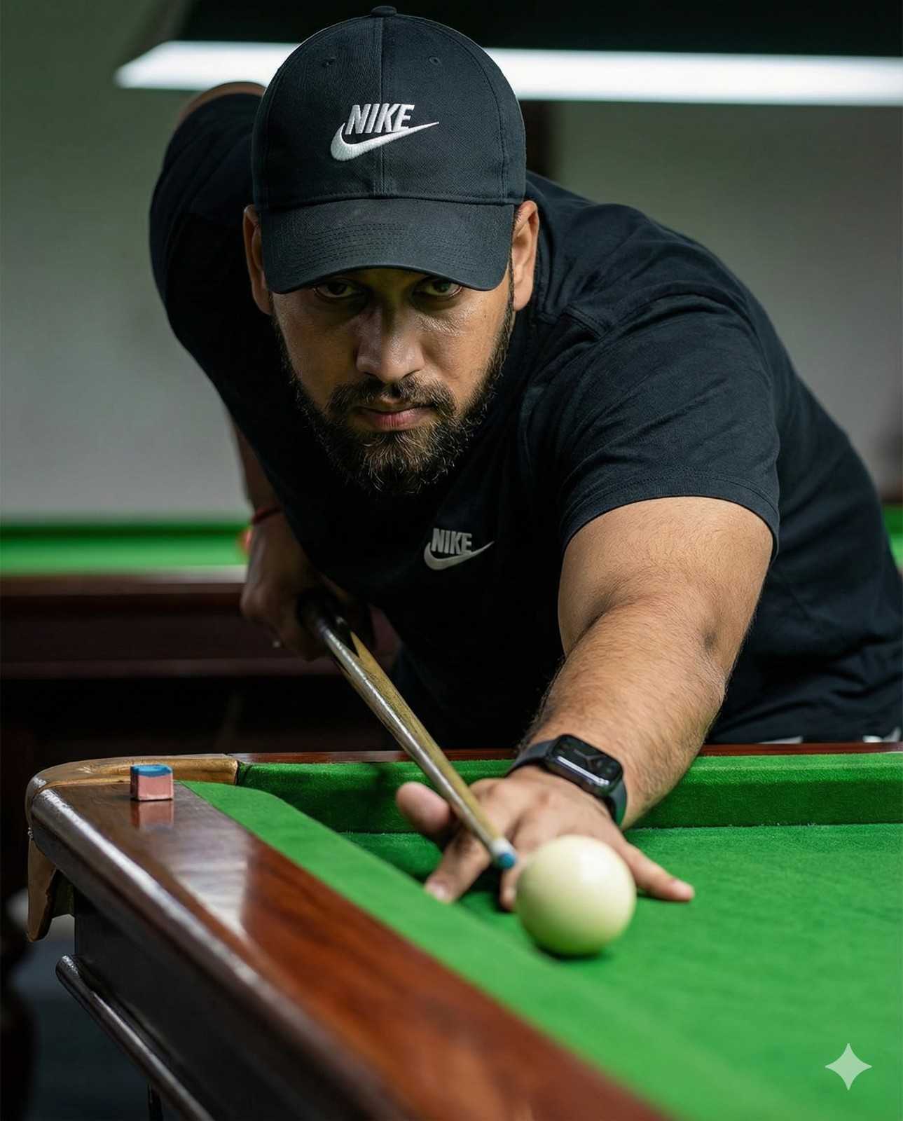 Use 100% of the face from the uploaded photo. An ultra-realistic, hyper-detailed 8K portrait of a 40-year-old man wearing a NIKE cap, playing pool (billiards). Capture him from a low-angle perspective as he leans forward, focusing intensely while lining up a shot. He is wearing a black NIKE t-shirt and a smartwatch on his left wrist, holding ho the cue stick. Preserve all facial features-hair, eyes, nose, mouth, skin tone, and expression-exactly as in the reference photo. Enhance textures of skin, clothing, pool table, cue stick, and surrounding objects. High contrast, vivid colors, ultra-sharp details, photorealistic lighting and shadows. Render in cinematic, ultra-high 8K resolution.
