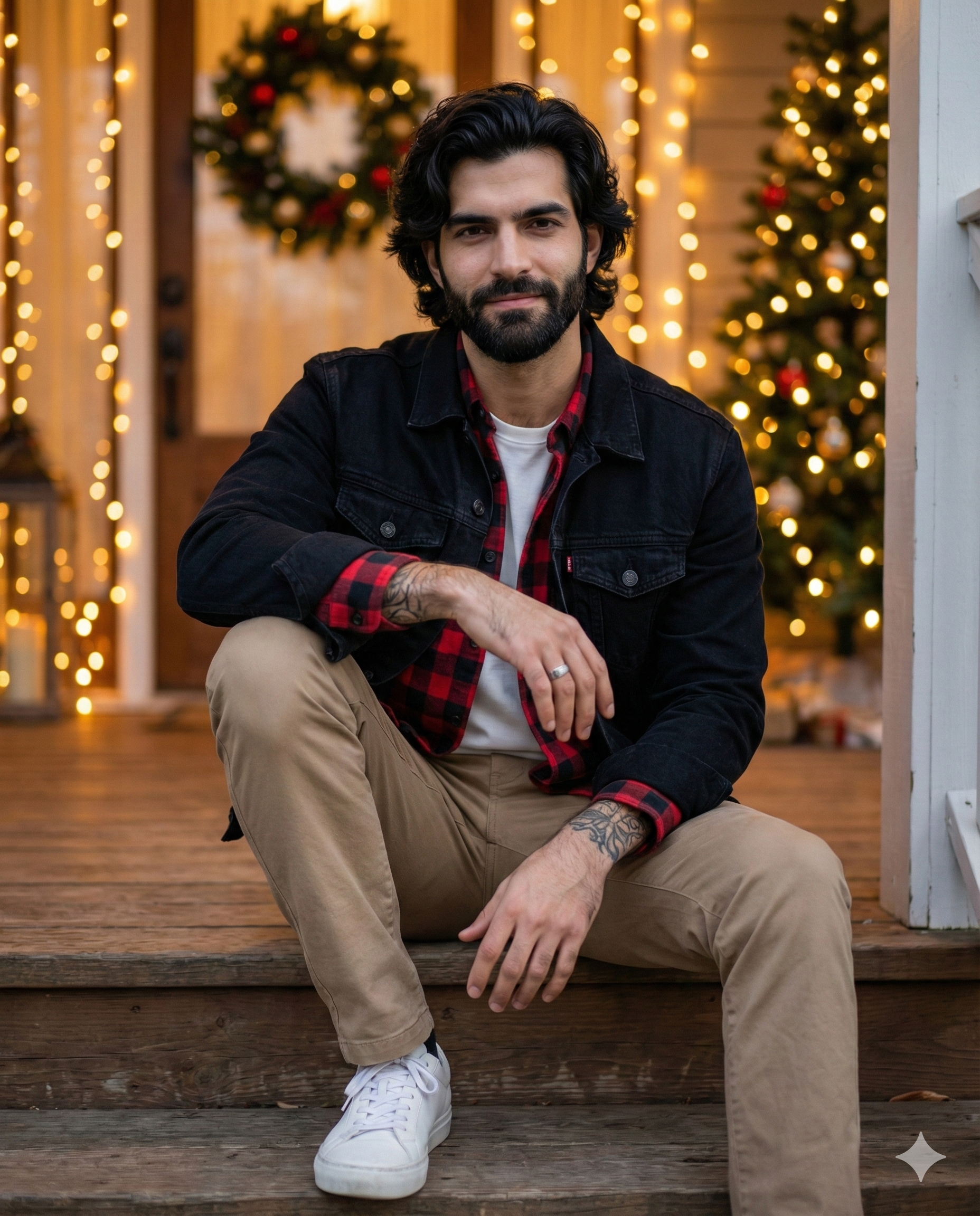 Use reference photo — ultra-realistic cinematic portrait of the same man (use the uploaded image reference the face), seated on porch steps with one knee up, wearing a black denim jacket over a checked shirt and white tee, khaki pants, white sneakers; visible right forearm tattoo and silver ring; warm bokeh string lights and Christmas wreath/tree in background, calm slight smile, soft evening light. Use my picture for reference.
