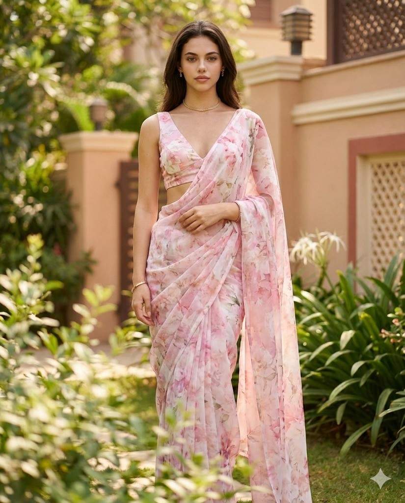 A woman(use the uploaded image reference the face) is standing gracefully in an outdoor garden-like setting with soft greenery surrounding her, including leafy plants in the foreground that create a gentle natural blur, adding depth and a dreamy, cinematic feel to the image. Behind her are warm-toned residential walls and subtle architectural elements, softly out of focus, ensuring all attention remains on her. She has a slim, elegant physique and a relaxed yet confident posture, standing slightly angled toward the camera with one arm resting naturally by her side and the other gently holding the drape of her saree, creating a poised and effortless stance. Her face is delicate and refined with smooth, warm-toned skin, soft cheek contours, a straight nose, expressive dark eyes, and naturally shaped brows. Her expression is calm, composed, and subtly warm, with a gentle, almost neutral smile that conveys quiet confidence. She is looking directly toward the camera, creating a strong yet soft connection with the viewer. Her hair is long, dark brown to black in color, parted slightly to one side and styled straight with a natural flow, falling neatly over her shoulders with a healthy sheen. She is wearing a pastel pink and white floral saree with a lightweight, flowing fabric, draped elegantly to reveal soft pleats and a fluid silhouette. The saree is paired with a matching sleeveless blouse featuring a deep V neckline and delicate detailing along the hem, revealing her midriff in a tasteful and fashion-forward manner. Minimal jewelry complements her look, including a delicate choker-style necklace, subtle earrings, and a thin bracelet, maintaining an elegant and refined aesthetic. The lighting is soft natural daylight, evenly illuminating her face and outfit while creating gentle shadows that enhance depth without harsh contrast. The overall color palette is warm and romantic, dominated by soft pinks, whites, greens, and earthy tones, giving the image a serene, graceful, and editorial atmosphere. The scene feels modern yet timeless, blending traditional attire with a fresh outdoor setting. Use this uploaded photo as the only and exact face reference. The generated image must use this same face exactly as shown, without any changes to identity, facial structure, or expression.