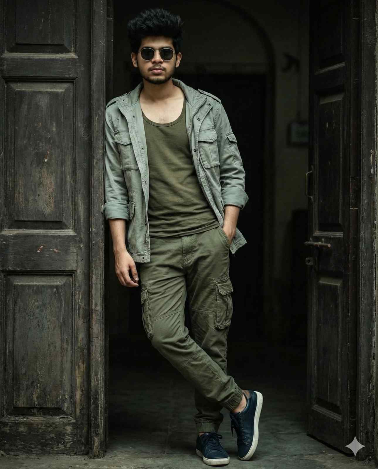 A stylish man(use the uploaded image reference the face) with glasses leaning casually against a dark doorway, dressed in a rugged and casual streetwear outfit. He is wearing an olive green tank top layered with a light grey-green cargo jacket with rolled-up sleeves. His lower half is styled with olive green cargo pants featuring side pockets, paired with dark navy-blue casual sneakers with white soles.