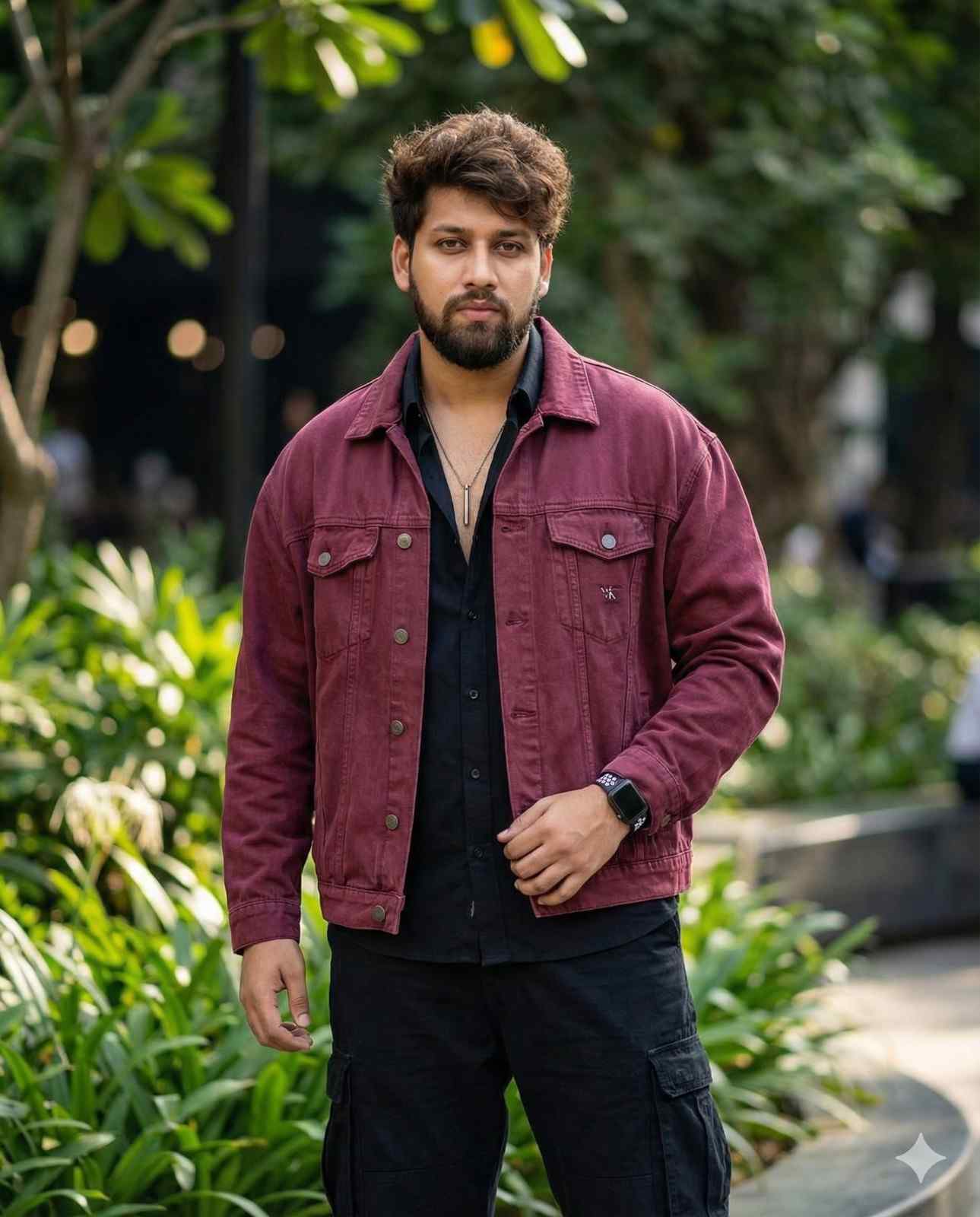 16K ultra-realistic DSLR photo using the exact same face from the uploaded reference image with absolute identity preservation. Do NOT change the face in any way — no alterations to facial structure, proportions, age, expression, skin tone, texture, facial hair, or any identity-defining features. The face must match the reference perfectly and remain completely unchanged. A stylish young man with identity-consistent messy, voluminous hair (same hairline and density as the reference), giving a confident, attitude-driven pose outdoors. Masculine, self-assured presence with relaxed body language. OUTFIT: Oversized wine-coloured denim jacket with realistic heavy denim texture. Deep black button-up shirt underneath. Black baggy cargo pants with natural folds and weight. Vertical bar pendant necklace. Black-and-white Apple Watch on the wrist. A subtle, minimal logo detail on the outfit — understated and realistic. ENVIRONMENT & COMPOSITION: Vibrant natural outdoor setting with lush urban vibes. Background softly blurred with a clean, cinematic black-toned bokeh (depth-of-field blur only, no stylization). Subject clearly separated from the background. LIGHTING & STYLE: Natural daylight with soft directional light shaping the face and outfit. Sharp focus, extreme detail, true skin texture, realistic fabric rendering. Professional fashion photography look — clean, modern, ultra-realistic, no artificial effects, no stylized filters.