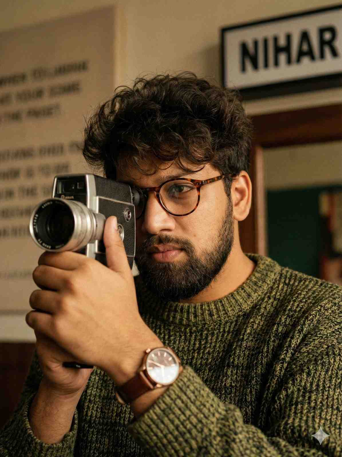Close-up portrait of a (from uploaded image) with messy dark curly hair and round glasses, wearing a textured green and black knit sweater, looking intently through the viewfinder of a vintage 8mm film camera. He has a wristwatch on his left wrist. The background is softly blurred, showing hints of text and a nok sign. Warm, soft, cinematic lighting, retro aesthetic, high detail, magazine editorial photography, film grain --ar 3:4